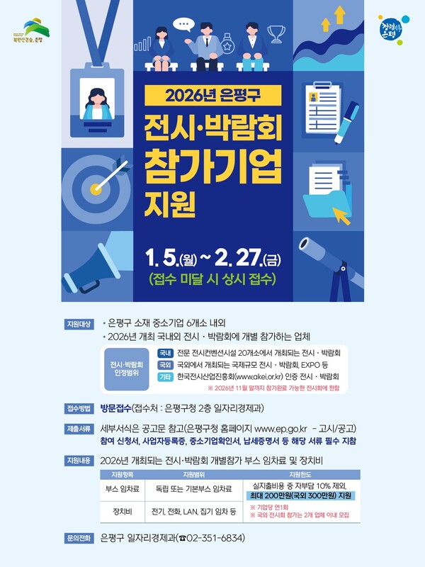 [21ÀºÆò´º½º=±è¼öÁ¤ ±âÀÚ] ÀºÆò±¸(±¸Ã»Àå ±è¹Ì°æ)´Â ³»´Þ 27ÀϱîÁö ¡®2026³â ±¹³»¿Ü Àü½Ã‧¹Ú¶÷ȸ °³º° Âü°¡ Áö¿ø»ç¾÷¡¯¿¡ Âü¿©ÇÒ ±â¾÷À» ¸ðÁýÇÑ´Ù°í ¹àÇû´Ù. À̹ø »ç¾÷Àº °ü³» Áß¼Ò±â¾÷À» ´ë»óÀ¸·Î ±¹³»¿Ü Àü½Ã¡¤¹Ú¶÷ȸ Âü°¡ ½Ã ¼Ò¿äµÇ´Â ºñ¿ëÀÇ ÀϺθ¦ Áö¿øÇØ, ±â¾÷µéÀÇ ÆÇ·Î °³Ã´°ú È«º¸ Ȱµ¿À» µ½±â À§ÇØ ÃßÁøµÆ´Ù.