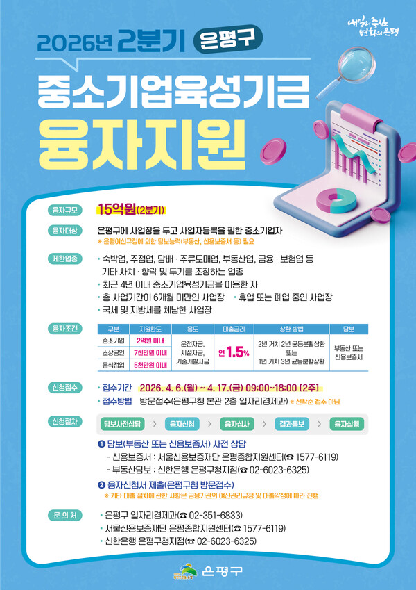 [21ÀºÆò´º½º=±è¼öÁ¤ ±âÀÚ] ÀºÆò±¸(±¸Ã»Àå ±è¹Ì°æ)´Â °ü³» Áß¼Ò±â¾÷°ú ¼Ò»ó°øÀÎÀÇ °æ¿µ ¾ÈÁ¤À» À§ÇØ 15¾ï ¿ø ±Ô¸ðÀÇ 2026³â 2ºÐ±â Áß¼Ò±â¾÷À°¼º±â±Ý À¶ÀÚ¸¦ ½ÃÇàÇÑ´Ù°í ¹àÇû´Ù.
