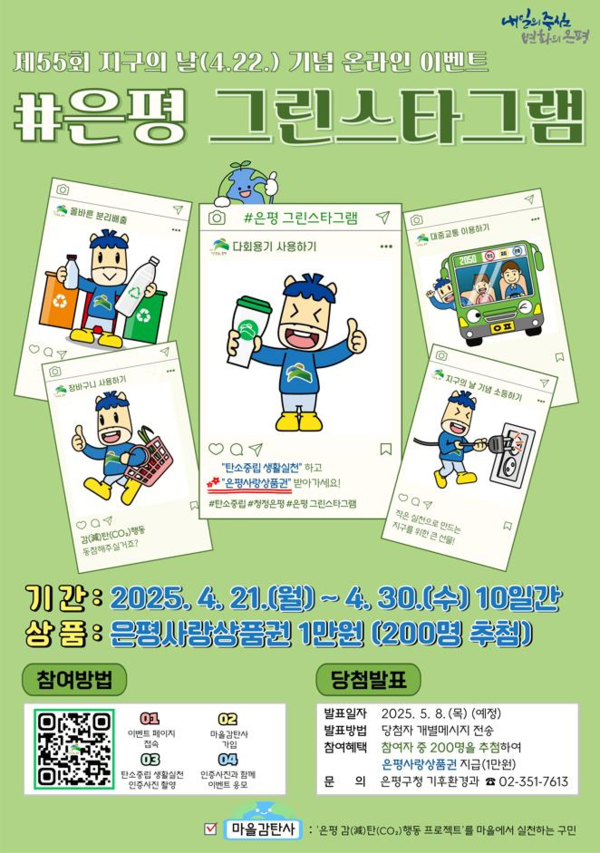 | [21ÀºÆò´º½º=±è¼öÁ¤ ±âÀÚ] ÀºÆò±¸(±¸Ã»Àå ±è¹Ì°æ)´Â 22ÀÏÀÎ Á¦55ȸ Áö±¸ÀÇ ³¯À» ±â³äÇØ ¡®#ÀºÆò ±×¸°½ºÅ¸±×·¥¡¯ ¿Â¶óÀÎ À̺¥Æ®¸¦ 21ÀϺÎÅÍ 30ÀϱîÁö ÃÑ 10Àϰ£ °³ÃÖÇÑ.. |