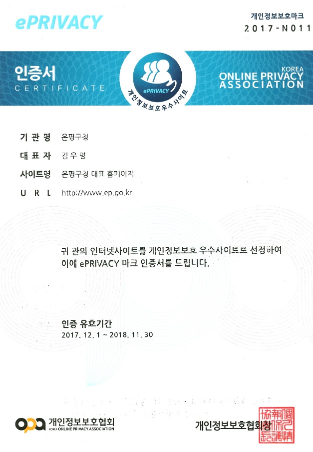 Á¤º¸Åë½Å ±â¼úÀÌ ¹ß´ÞµÇ¾î °³ÀÎÁ¤º¸ ¼öÁý ¹× À¯Æ÷°¡ ¿ëÀÌÇÔ¿¡ µû¶ó °³ÀÎÁ¤º¸ À¯Ãâ µîÀ» ¹æÁöÇϰíÀÚ ÀºÆò±¸´Â ¼¿ï½Ã ÀÚÄ¡±¸ ÃÖÃÊ·Î °³ÀÎÁ¤º¸º¸È£Çùȸ¿¡¼ °³ÀÎÁ¤º¸º¸È£ ¼öÁØÀ» ÀÎÁõÇÏ´Â ¡°°³ÀÎÁ¤º¸º¸È£ ¿ì¼ö »çÀÌÆ® ¸¶Å©(ePRIVACY)¡±¸¦ ȹµæÇß´Ù°í ¹àÇû´Ù.