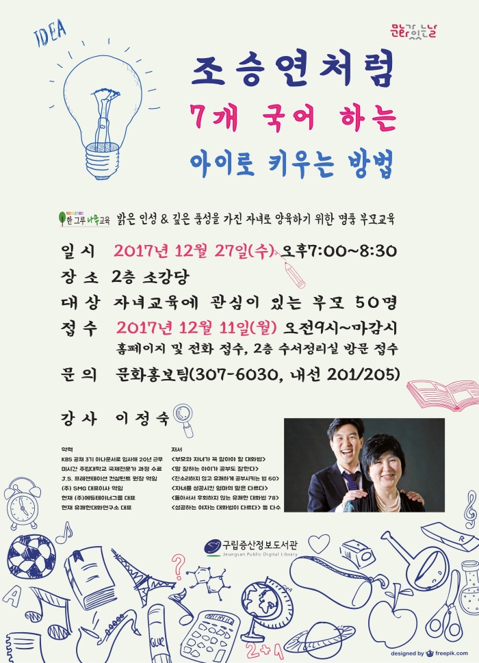 ¿À´Â 12¿ù 27ÀÏ¿¡´Â À¯ÄèÇÑ´ëÈ¿¬±¸¼Ò ÀÌÁ¤¼÷ ´ëÇ¥°¡ ¡®Á¶½Â¿¬Ã³·³ 7°³ ±¹¾îÇÏ´Â ¾ÆÀ̷ΠŰ¿ì´Â ¹æ¹ý¡¯À» ÁÖÁ¦·Î °¿¬ÇÒ ¿¹Á¤ÀÌ´Ù. ÀÌÁ¤¼÷ ´ëÇ¥´Â KBS °øÃ¤ 3±â ¾Æ³ª¿î¼·Î ÀÔ»çÇØ 20³â°£ ±Ù¹«ÇßÀ¸¸ç ÇöÀç´Â Ä¿¹Â´ÏÄÉÀÌ¼Ç Àü¹®°¡·Î ´Ù¾çÇÑ È°µ¿À» Çϰí ÀÖ´Ù. ƯÈ÷ ¾ð¾îõÀç Á¶½Â¿¬ÀÇ ¾î¸Ó´Ï·Î ¾Ë·ÁÁö¸é¼ ±× À°¾Æ¹ý°ú ´ëȹýÀÌ ÁÖ¸ñÀ» ¹Þ°í ÀÖ´Ù. Àú¼·Î´Â ¡º¾çÀ°ÀÇ ½Å¡»¡ººÎ¸ðÀÇ ´ëȹý¡»¡º¸» ÀßÇÏ´Â ¾ÆÀ̰¡ °øºÎµµ ÀßÇÑ´Ù¡»¡º¼º°øÇÏ´Â ¿©ÀÚ´Â ´ëȹýÀÌ ´Ù¸£´Ù¡»µîÀÌ ÀÖ´Ù.