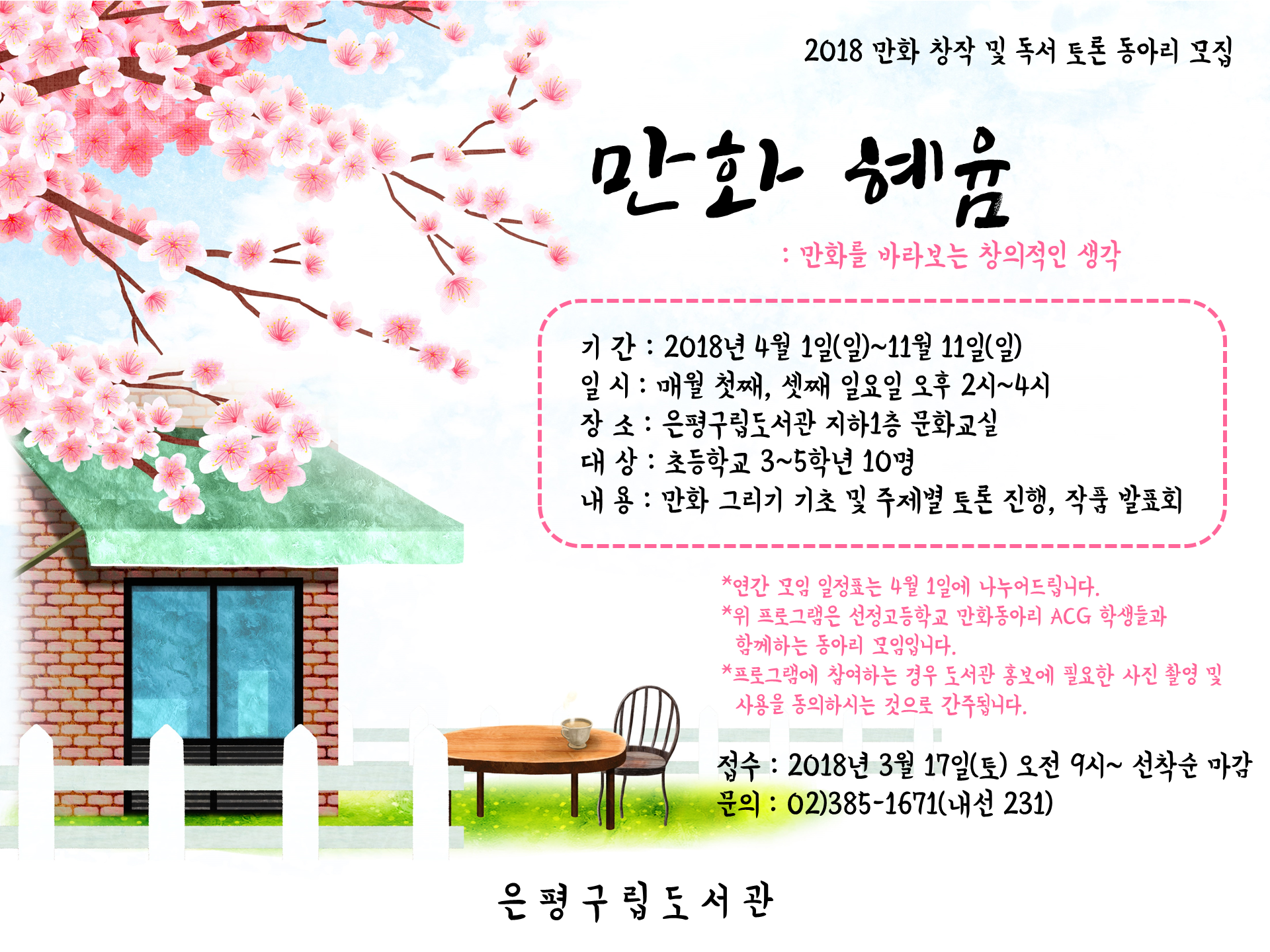 2018³âµµ µ¿¾Æ¸® ¿î¿µ ±â°£Àº 4¿ùºÎÅÍ 11¿ù±îÁö·Î ¿ù 2ȸÀÇ Á¤±â ¸ðÀÓÀ» ÅëÇØ ¸¸È ±×¸®±â ±âÃʺÎÅÍ ¸¸È Àаí ÇØ¼®Çϱâ, »çȸ ¹®Á¦¿Í Á¢¸ñ½Ã۱⠵îÀÇ Æø³ÐÀº Åä·Ð Ȱµ¿À» ÁøÇàÇÒ °èȹÀÌ´Ù. Á¢¼ö´Â 3¿ù 17ÀϺÎÅÍ ÀºÆò±¸¸³µµ¼°ü(385-1671, ³»¼± 231)¿¡¼ ¹Þ°í ÀÖ´Ù.