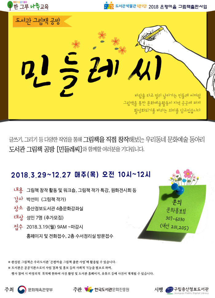 ±¸¸³Áõ»êÁ¤º¸µµ¼°ü(°üÀå ±è¼÷°æ)Àº ¹®ÈüÀ°°ü±¤ºÎ¿¡¼ ÁÖÃÖÇϰí Çѱ¹µµ¼°ü¹®ÈÁøÈï¿ø¿¡¼ ÁÖ°üÇÏ´Â ¡®µµ¼°ü¡¤¹Ú¹°°ü¡¤¹Ì¼ú°ü 1°ü1´Ü¡® »ç¾÷¿¡ 2³â ¿¬¼Ó ¼±Á¤µÇ¾î, ¿À´Â 3¿ù 29ÀϺÎÅÍ Áö¿ªÁֹεéÀÌ Á÷Á¢ ±×¸²Ã¥À» ±âȹ/Á¦ÀÛ/ÃâÆÇÇÏ´Â ¹®È¿¹¼úÄ¿¹Â´ÏƼ ¡®2018 µµ¼°ü ±×¸²Ã¥°ø¹æ [¹Îµé·¹¾¾](ÀÌÇÏ ¡¯¹Îµé·¹¾¾¡®)¸¦ ¿î¿µÇÑ´Ù.