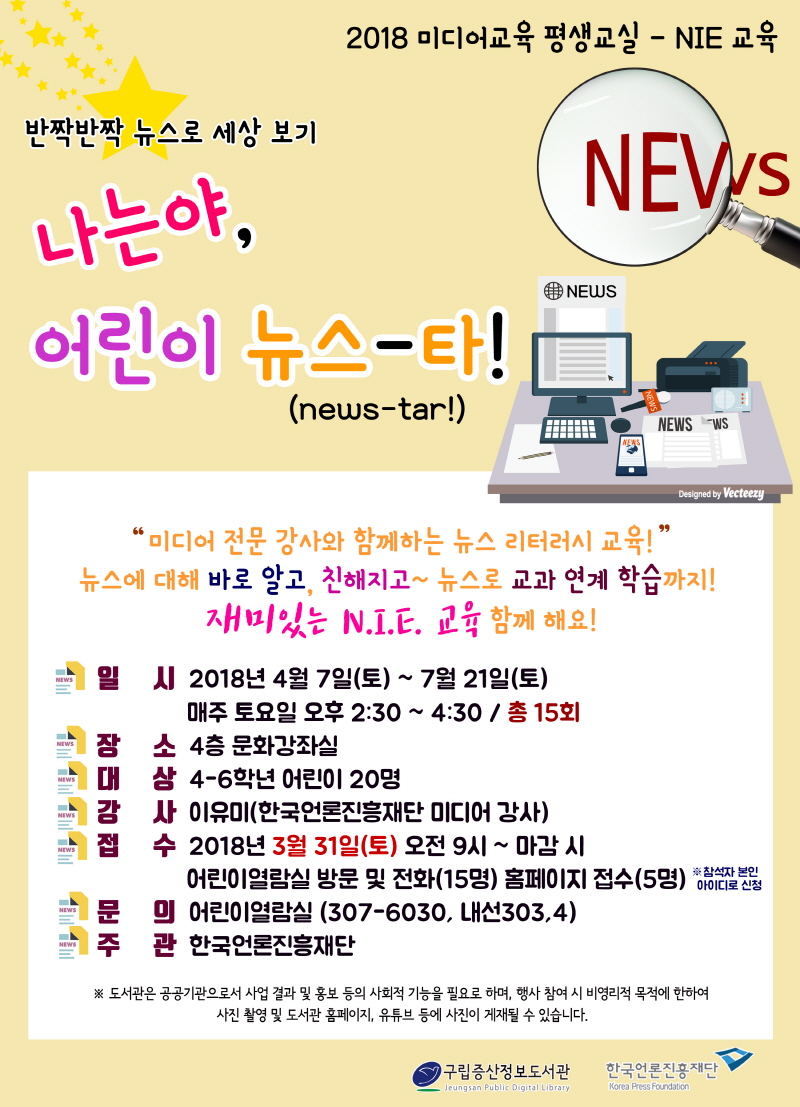 ±¸¸³Áõ»êÁ¤º¸µµ¼°ü(°üÀå ±è¼÷°æ)Àº Çѱ¹¾ð·ÐÁøÈïÀç´Ü¿¡¼ ÁÖÃÖÇÏ´Â ¡®2018 ¹Ìµð¾î Æò»ý±³½Ç¡¯ °ø¸ð¿¡ ¼±Á¤µÇ¾î ¿À´Â 4¿ù 7ÀϺÎÅÍ 7¿ù 21ÀϱîÁö ¾î¸°ÀÌ ´ë»ó ´º½º ¸®ÅÍ·¯½Ã(NIE) ±³À°À» ½Ç½ÃÇÑ´Ù.