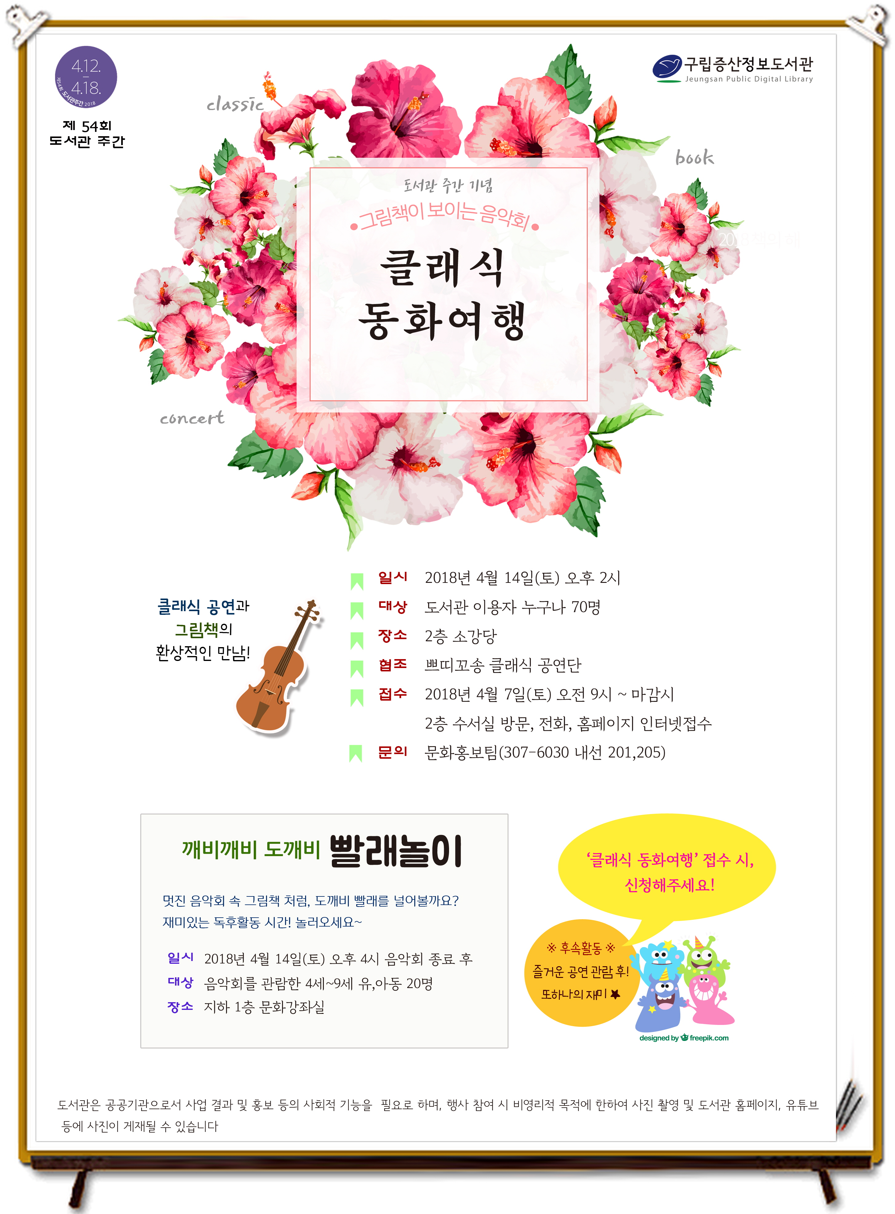 ±¸¸³Áõ»êÁ¤º¸µµ¼°ü(°üÀå ±è¼÷°æ)Àº Á¦ 54ȸ µµ¼°üÁÖ°£(4.12~18)À» ¸ÂÀÌÇÏ¿© ¿À´Â 4¿ù 14ÀÏ ¡®±×¸²Ã¥ÀÌ º¸ÀÌ´Â À½¾Çȸ <Ŭ·¡½Ä ¼Ó µ¿È¿©Çà>¡¯À» ÁøÇàÇÑ´Ù.