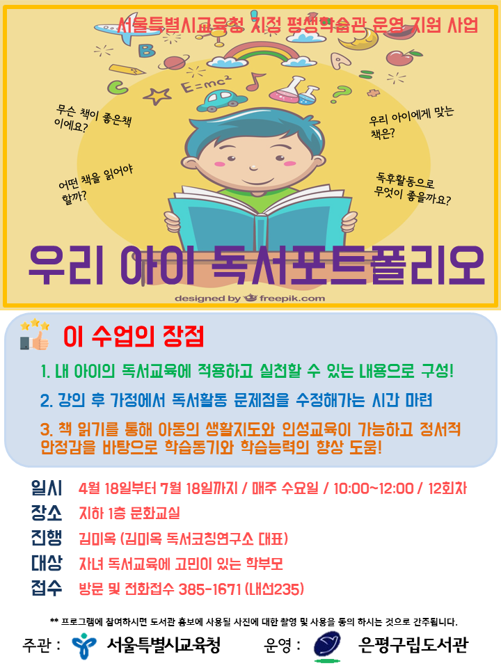 ÀºÆò±¸¸³µµ¼­°ü(°üÀå ±Ç¿µ°ü)Àº ¼­¿ïƯº°½Ã±³À°Ã»ÀÇ Áö¿øÀ» ¹Þ¾Æ ÇкθðµéÀ» ´ë»óÀ¸·Î ÀÚ³à µ¶¼­ ±³À°¿¡ µµ¿òÀÌ µÇ´Â ¡®¿ì¸® ¾ÆÀÌ µ¶¼­ Æ÷Æ®Æú¸®¿À¡¯ ÇÁ·Î±×·¥À» ¿î¿µÇÑ´Ù. À̹ø °­ÀÇ´Â ¡ãµ¶¼­ÀÇ Á߿伺°ú Áöµµ¹ý ¡ãÁÖÁ¦º° µµ¼­ÀÇ Æ¯Â¡°ú Ã¥Àб⠡ãÀ¶ÇÕµ¶¼­¹ý ¡ã13¼¼±îÁöÀÇ µ¶¼­Ç÷£ ¡ã³» ¾ÆÀÌ¿¡°Ô ¸Â´Â Ã¥ ¼±Á¤ ¡ã¾ÆÀÌ¿Í ÇÔ²²ÇÏ´Â µ¶ÈÄȰµ¿ µî µ¶¼­ ±³À°¿¡ ¹Ù·Î Àû¿ëÇÏ°í ½ÇõÇÒ ¼ö ÀÖ´Â ³»¿ëÀ¸·Î ±¸¼ºÇß´Ù. ¿î¿µ ±â°£Àº 4¿ù 18ÀϺÎÅÍ 7¿ù 18ÀϱîÁö ÃÑ 12ȸ·Î ÁøÇàµÇ¸ç, ´Ù¾çÇÑ ÁÖÁ¦ÀÇ µµ¼­¸¦ »ìÆìº¸°í ¸ÅÁÖ ÀÚ³àµé°ú ÇÔ²² ÇÒ ¼ö ÀÖ´Â µ¶¼­ Ȱµ¿ °úÁ¦¸¦ ÅëÇØ °¢ ÄÉÀ̽º¸¦ °øÀ¯ÇÏ°í ºÐ¼®ÇÏ´Â ½Ã°£À» °¡Áú ¿¹Á¤ÀÌ´Ù.