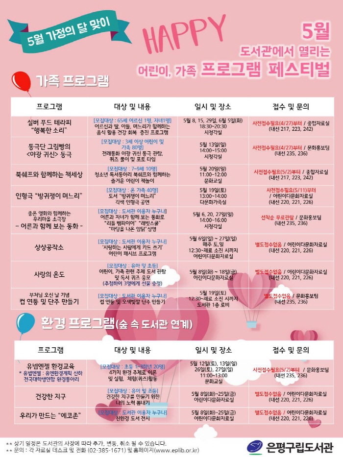 ÀºÆò±¸¸³µµ¼°ü(°üÀå ±Ç¿µ°ü)Àº 5¿ù °¡Á¤ÀÇ ´ÞÀÇ ¸ÂÀÌÇÏ¿© ¿Â °¡Á·ÀÌ ÇÔ²² ÇÒ ¼ö ÀÖ´Â ´Ùä·Î¿î ÇÁ·Î±×·¥°ú Àü½Ãȸ°¡ ÁøÇàµÈ´Ù. ºÎ¸ð¿Í ¾ÆÀ̰¡ ÇÔ²² Âü¿©ÇÒ ¼ö ÀÖ´Â ÇÁ·Î±×·¥À¸·Î µ¿±Ø´Ü ±×¸²»§ÀÇ <¾ß±¤ ±Í½Å> µ¿±Ø°ú <¹æ±ÍÀïÀÌ ¸ç´À¸®> ÀÎÇü±Ø °ø¿¬ÀÌ ÁغñµÆ´Ù. ¾ÆÀ̵éÀÌ ÁÁ¾ÆÇÏ´Â ±×¸²Ã¥À» °¢»öÇØ ¸¸µç ÀÎÇü±ØÀ¸·Î Ã¥¿¡¼ ºÃ´ø Ä£¼÷ÇÑ ÁÖÀΰøµéÀÌ ³ªÅ¸³ª ¾ÆÀ̵éÀÇ »ó»ó·ÂÀ» ÀÚ±ØÇÏ´Â ½Ã°£ÀÌ µÉ °ÍÀÌ´Ù.¾î¸°ÀÌ´Ù¹®ÈÀÚ·á½Ç¿¡¼´Â ¾î¸°ÀÌ, °¡Á· °ü·Ã ÁÖÁ¦ µµ¼¸¦ °ü¶÷ ÈÄ Âü¿©ÇÒ ¼ö ÀÖ´Â µ¶¼ ÄûÁî ÀÀ¸ð À̺¥Æ®¿Í »ç¶ûÇÏ´Â °¡Á·¿¡°Ô Ä«µå¸¦ ¾µ ¼ö ÀÖµµ·Ï <»ó»ó°øÀÛ¼Ò> ÆÐ½Ãºê ÇÁ·Î±×·¥À» ÁøÇàÇÑ´Ù. ¸ÅÁÖ ÀÏ¿äÀÏ ¿ÀÈÄ 2½Ã¿¡´Â ¿ì¸®¸¶À» ¼Ò±ØÀåÀÌ ¿î¿µµÇ¸ç 5¿ùÀÇ Å׸¶´Â ¾î¸¥°ú ÇÔ²² º¸´Â ¿µÈ·Î <¸®Æ² ¹ìÆÄÀ̾î> <·¡ºø½ºÄð> <¸¶´çÀ» ³ª¿Â ¾Ïż> µî ¸ðµÎ°¡ ÇÔ²² º¼ ¼ö ÀÖ´Â ¾Ö´Ï¸ÞÀ̼ÇÀÌ »ó¿µµÈ´Ù. ¿ÃÇØ Áغñ ÁßÀÎ ½£ ¼Ó µµ¼°ü°ú ¿¬°èµÈ ȯ°æ °ü·Ã ÇÁ·Î±×·¥µµ ÀÖ´Ù. À¯³ÜÇѱ¹À§¿øÈ¸ÀÇ Áö¿øÀ» ¹Þ¾Æ ¾î¸°ÀÌ ´ë»óÀ¸·Î Áö±¸ ȯ°æÀ̽´¿¡ ´ëÇÑ ÀÌÇØ¿Í ÀνÄÀ» ¹Ù·ÎÀâ±â À§ÇÑ Áö¼Ó°¡´ÉÇÑ È¯°æÃ¼Çè±³À°ÀÌ 4ȸÂ÷¿¡ °ÉÃÄ ÁøÇàµÈ´Ù. °¡Á¤ÀÇ ´ÞÀ» ¸Â¾Æ ³ªµéÀÌ Àå¼Ò¸¦ °í¹ÎÇÏ´Â °¡Á·µéÀÌ ÁÖ¸»¿¡ µµ¼°ü¿¡ ¹æ¹®ÇÏ¿© ´Ù¾çÇÑ ¹®ÈÇÁ·Î±×·¥¿¡ Âü¿©Çغ¸´Â °Ç ¾î¶³±îÀÚ¼¼ÇÑ »çÇ×Àº ȨÆäÀÌÁö(http://www.eplib.or.kr)¸¦ ÂüÁ¶Çϰųª ÀºÆò±¸¸³µµ¼°ü(385-1671, ³»¼±235)À¸·Î ¹®ÀÇÇÏ¸é µÈ´Ù.