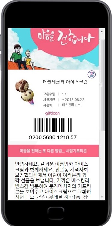 °£ÆíÇÑ Å¬¸¯ Çϳª·Î ¾ÆÀ̽ºÅ©¸²À» ³ìÁö ¾Ê°Ô Àü´ÞÇÒ ¼ö ÀÖ°í ¾î¸°À̵éÀÌ ¸Ô°í ½ÍÀ» ¶§ Àü±¹ ¾îµð¿¡¼³ª ¼Õ½±°Ô ±¸¸ÅÇÒ ¼ö ÀÖ´Â Æí¸®ÇÑ ¸ð¹ÙÀÏ »óǰ±Ç ¼±¹° À̺¥Æ®´Â Áö³ÇØ Áø°üµ¿ Áö¿ª»çȸº¸ÀåÇùÀÇüÀÇ ÈÄ¿øÀ¸·Î ½ÃÀ۵ǾúÀ¸¸ç ¾î¸°À̵é°ú ºÎ¸ð´ÔµéÀÇ ¶ß°Å¿î È£ÀÀÀ¸·Î ¿ÃÇØ´Â ±Ý¾×À» 2¹è·Î Áõ¾×ÇÏ¿© 119¸íÀÇ ÃʵîÇб³ ¾î¸°À̵鿡°Ô ¾ÆÀ̽ºÅ©¸² ±âÇÁƼÄÜÀ» Àü´ÞÇÏ¿´´Ù.