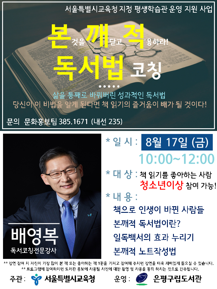 Àü¹® µ¶¼¹ý ÄÚĪ ¡®Àϵ¶¹é¼ÀÇ È¿°ú º»±úÀû µ¶¼±â¼ú ¿©Ç࡯ ÀºÆò±¸¸³µµ¼°ü(°üÀå ±Ç¿µ°ü)Àº 8¿ù 17ÀÏ ±Ý¿äÀÏ ¿ÀÀü 10½Ã ½Ãû°¢½Ç¿¡¼ ¹è¿µº¹ ÀÚ±â°æ¿µÄÚÄ¡½ºÄð ´ëÇ¥¸¦ ÃÊÃ»ÇØ µ¶¼¹ý ÄÚĪ °¿¬À» ÁøÇàÇÑ´Ù.À̹ø °¿¬Àº Àϵ¶¹é¼ÀÇ È¿°ú¸¦ °æÇèÇϰí üµæÇÒ ¼ö ÀÖµµ·Ï ¡ãµ¶¼¸¶Àεå¼Â ¡ãº»±úÀû µ¶¼¹ý ¡ãºÏ ¹ÙÀδõ µîÀÇ ³»¿ëÀ» ¹ÙÅÁÀ¸·Î Ã¥ Àб⿡ ´ëÇÑ °íÁ¤°ü³äÀ» ±ú°í ¿Ã¹Ù¸¥ µ¶¼½À°üÀ» ¸¸µé ¼ö ÀÖµµ·Ï Âü¿©ÀÚ °³Àο¡ ¸Â´Â µ¶¼¹ý ÄÚĪÀ» ÁøÇàÇÑ´Ù.ÀÌ °¿¬¿¡ ÀÚ½ÅÀÌ °¡Àå ¸¹ÀÌ Àоú´ø Ã¥ ¶Ç´Â ÁÁ¾ÆÇϴ åÀ» °®°í Âü¿©ÇÏ¸é °¢ÀÚ¿¡ ¸Â´Â µ¶¼¹ýÀ» ÄÚĪÇÏ¿© ½º½º·Î Ã¥ ÀбâÀÇ Áñ°Å¿òÀ» ã¾Æ°¥ ¼ö ÀÖµµ·Ï µµ¿òÀ» ÁÙ ¿¹Á¤ÀÌ´Ù.¼ö°½ÅûÀº Áö¿ªÁֹΠ´©±¸³ª °¡´ÉÇϰí ÀüÈÁ¢¼ö, ¹æ¹®Á¢¼ö ÇÒ ¼ö ÀÖÀ¸¸ç, ¼ö°·á´Â ¹«·áÀÌ´Ù.