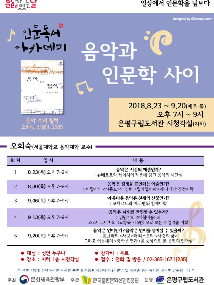 ÀºÆò±¸¸³µµ¼°ü(°üÀå ±Ç¿µ°ü)Àº ¹®ÈüÀ°°ü±¤ºÎ°¡ ÁÖÃÖÇϰí Çѱ¹ÃâÆÇ¹®È»ê¾÷ÁøÈï¿øÀÌ ÁÖ°üÇÏ´Â Àι®µ¶¼ ¾ÆÄ«µ¥¹Ì ¼±Á¤µÇ¾î ¡®Àϻ󿡼 Àι®ÇÐÀ» ³Ñº¸´Ù¡¯¸¦ ½½·Î°ÇÀ¸·Î Àι®ÇÐ °¿¬À» ÁøÇàÇϰí ÀÖ´Ù. À̹ø °¿¬Àº µÎ ¹øÂ° ÁÖÁ¦·Î ¡®À½¾Ç¡¯À» ¼±Á¤ÇÏ¿© ¼¿ï´ëÇб³ À½¾Ç´ëÇÐ ¿ÀÈñ¼÷ ±³¼ö¸¦ ÃʺùÇÏ¿© ¡®½Ã°£¡¯ ¡®°¨Á¤¡¯ ¡®ÃµÀ硯 ¡®»çȸ¡¯ ¡®¾ð¾î¡¯ ¶ó´Â ´Ù¼¸ °¡Áö Ű¿öµå·Î À½¾ÇÀ» »ìÆìº¸´Â ½Ã°£À» °®´Â´Ù.¡ã 1ȸ À½¾ÇÀº ½Ã°£ÀÇ ¿¹¼úÀΰ¡? ¡ã 2ȸ À½¾ÇÀº °¨Á¤À» Ç¥ÇöÇÏ´Â ¿¹¼úÀΰ¡? ¡ã 3ȸ ¾Æ¸§´Ù¿î À½¾ÇÀº õÀçÀÇ »ê¹°Àΰ¡? ¡ã 4ȸ À½¾ÇÀº »çȸ¸¦ ¹Ý¿µÇÒ ¼ö Àִ°¡? ¡ã 5ȸ À½¾ÇÀº ¾ð¾îÀΰ¡? À½¾ÇÀº ¾ð¾î¸¦ ³Ñ¾î¼³ ¼ö ÀÖÀ»±î? µî ´Ù¾çÇÑ Å°¿öµå·Î À½¾ÇÀ» »ìÆìº¸´Â °úÁ¤À» ÅëÇØ ¿¹¼úÀ» ÀÌÇØÇÏ´Â Àι®ÇÐÀû ½Ã°¢À» ±æ·¯ÁÖ°í À½¾Ç¿¡ ´ëÇÑ ±íÀÌ ÀÖ´Â ÀÌÇØ¸¦ µ½±â À§ÇØ °¿¬À» ÁغñÇß´Ù.¡®À½¾Ç°ú Àι®ÇÐ »çÀÌ¡¯Àº ¿À´Â 8¿ù 23ÀϺÎÅÍ ¸ÅÁÖ ¸ñ¿äÀÏ ¿ÀÈÄ 7½Ã ÀºÆò±¸¸³µµ¼°ü ½Ãû°¢½Ç¿¡¼ ÃÑ 5ȸÂ÷·Î ÁøÇàµÈ´Ù.ÀÚ¼¼ÇÑ »çÇ×Àº ȨÆäÀÌÁö(http://www.eplib.or.kr)¸¦ ÂüÁ¶Çϰųª ÀºÆò±¸¸³µµ¼°ü(385-1671, ³»¼±235)À¸·Î ¹®ÀÇÇÏ¸é µÈ´Ù.