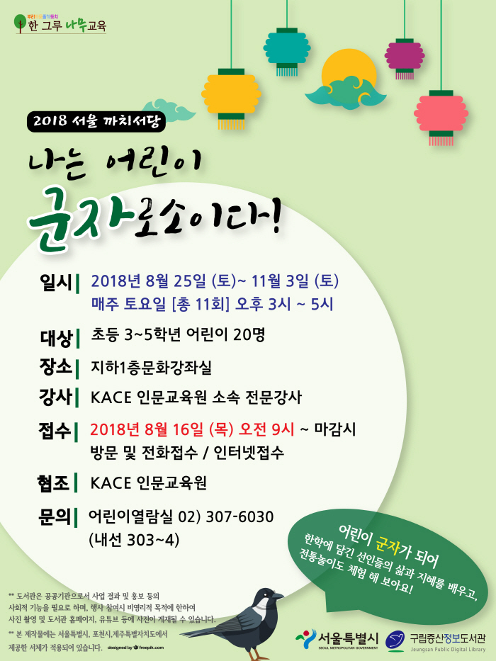 2017³â ±³À°ºÎ¿¡¼ ÀÎÁõÇÑ ¾î¸°ÀÌ Àμº±³À° ÇÁ·Î±×·¥À» °³¹ßÇÑ Çѱ¹Áö¿ª»çȸ±³À°ÇùÀÇȸ(KACE) Àι®±³À°¿øÀÇ ÇùÁ¶·Î ÁøÇàµÇ´Â <³ª´Â ¾î¸°ÀÌ ±ºÀڷμÒÀÌ´Ù!>´Â Ãʵî 3~5Çг⠾ÀÌ 20¸íÀ» ´ë»óÀ¸·Î ÁøÇàµÇ¸ç ¸ÅÁÖ Åä¿äÀÏ 2½Ã°£ µ¿¾È Á¶»óµéÀÇ »î°ú ÁöÇý°¡ ´ã±ä ÇÑÇÐ ±³À° ¹× Àç¹ÌÀÖ´Â ÀüÅë³îÀÌ ¹®È üÇè Ȱµ¿À» ÁøÇàÇÒ ¿¹Á¤ÀÌ´Ù.