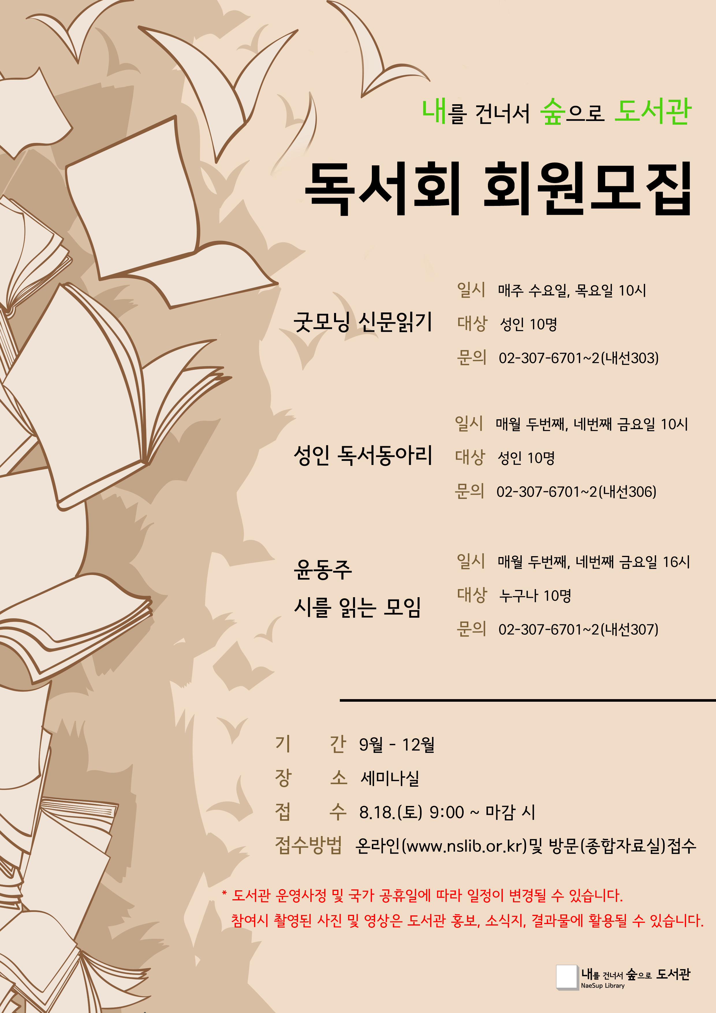 À̹ø µ¶¼ÀÇ´Þ ¹®È ÇÁ·Î±×·¥Àº »çÀü½ÅûÀ» ¹Þ¾Æ ÁøÇàÇϸç ÀÚ¼¼ÇÑ »çÇ×Àº ȨÆäÀÌÁö(http://www.nslib.or.kr)¸¦ ÂüÁ¶Çϰųª ³»¸¦°Ç³Ê¼½£À¸·Îµµ¼°ü(307-6701~2, ³»¼±307)À¸·Î ¹®ÀÇÇÏ¸é µÈ´Ù.