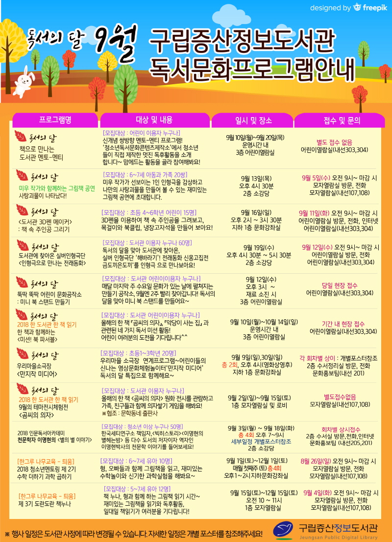 ÀºÆò±¸ ±¸¸³Áõ»êÁ¤º¸µµ¼°ü(°üÀå ±è¼÷°æ)¿¡¼´Â 9¿ù µ¶¼ÀÇ ´ÞÀ» ¸Â¾Æ ´Ù¾çÇÑ µ¶¼¹®È ÇÁ·Î±×·¥À» ÁøÇàÇÑ´Ù.