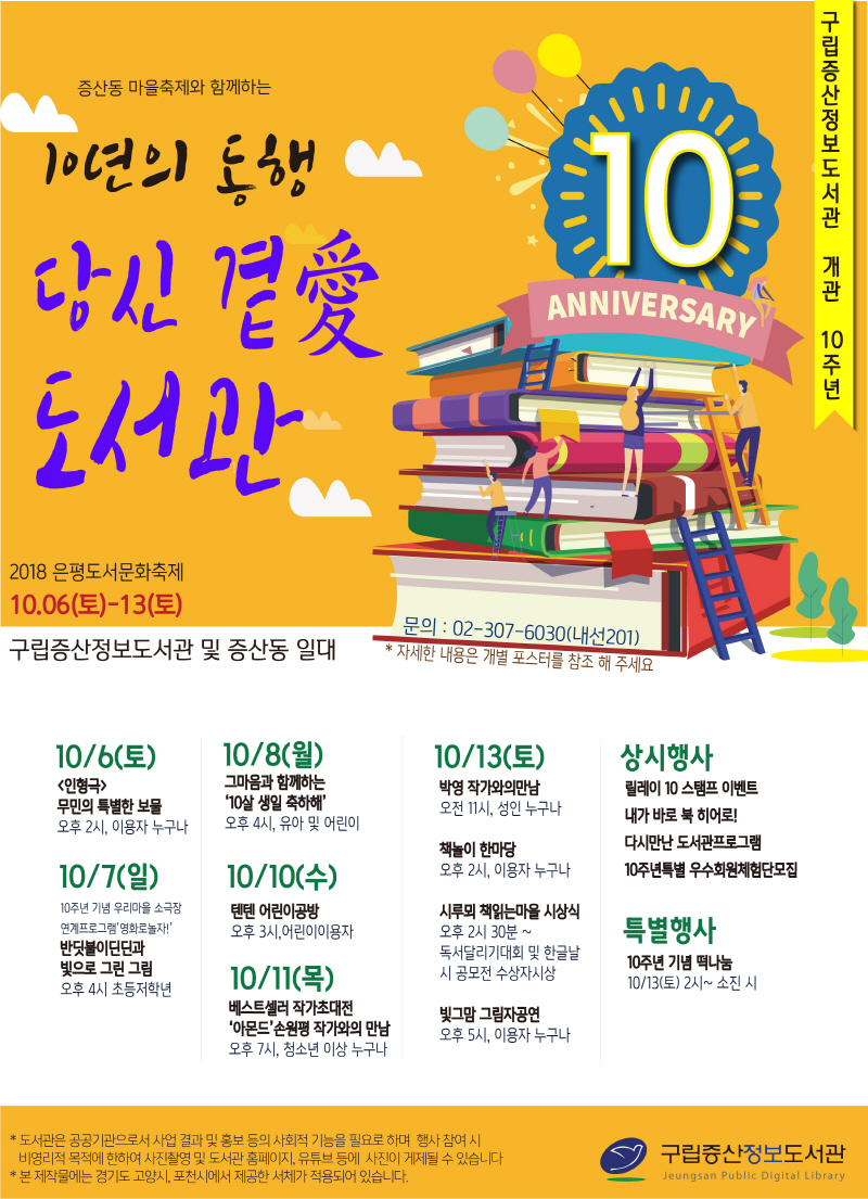 ±¸¸³Áõ»êÁ¤º¸µµ¼°ü 10Áֳ⠱â³ä ÃàÁ¦ ±â°£ ¸ÞÀÎ Çà»ç°¡ ÀÖ´Â 10¿ù 13ÀÏ¿¡´Â 2½ÃºÎÅÍ ½Ç½ÃµÇ´Â <Ã¥³îÀÌ ÇѸ¶´ç>¿¡¼ ´Ù¾çÇÑ Ã¼ÇèÇÁ·Î±×·¥°ú 10Áֳ⠱â³ä ¶± ³ª´²ÁÖ±â À̺¥Æ®°¡ ÁøÇàµÇ¸ç, 2½Ã 30ºÐ¿¡´Â Áõ»êµ¿ Áֹμ¾ÅÍ¿Í ÇÔ²²ÇÏ´Â ½Ã·ç¸þ Ã¥Àд ¸¶À» ½Ã»ó½Äµµ ÇÔ²² ÁøÇà µÉ ¿¹Á¤ÀÌ´Ù.