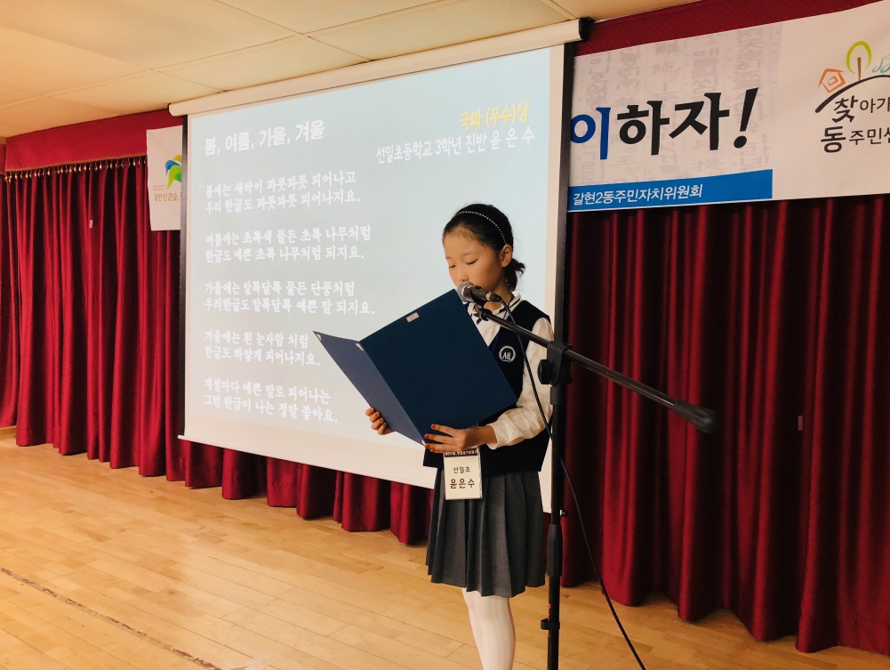 ÀºÆò±¸ °¥Çö2µ¿ ÁÖ¹ÎÀÚÄ¡À§¿øÈ¸¿¡¼´Â ÇѱÛâÁ¦ ¹ÝÆ÷ Á¦572µ¹ Çѱ۳¯À» ¾ÕµÎ°í ÇѱÛÀÇ ¿ì¼ö¼º°ú ¾Æ¸§´Ù¿òÀ» ½Ã(ãÌ)·Î Ç¥ÇöÇÏ´Â Çѱ۳¯ ±â³äÇà»ç ¹× ÀÛǰ ´ç¼±ÀÛ Àü½Ãȸ¸¦ Áö³ 2ÀÏ ¼ºÈ²¸®¿¡ °³ÃֵƴÙ.