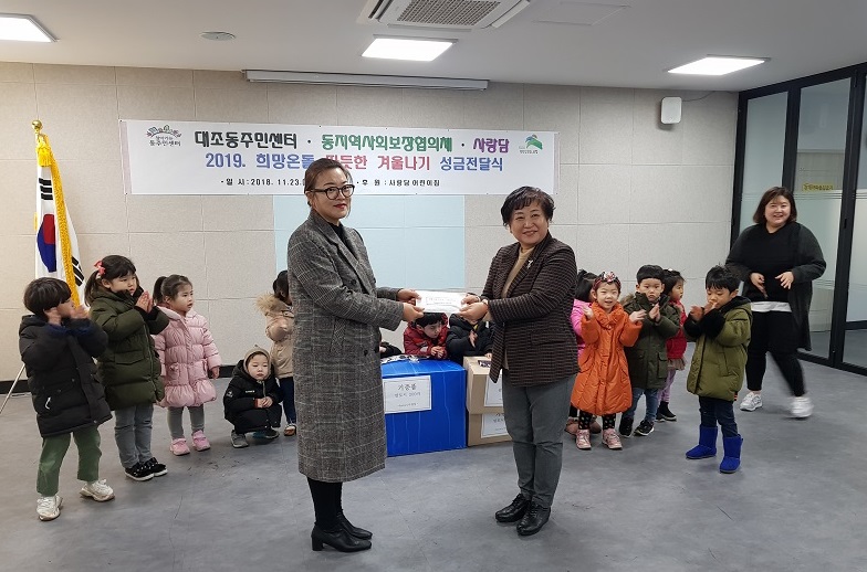 »ç¶ûÀÇ ³ª´® ¼º±ÝÀü´Þ½Ä¿¡´Â ´ëÁ¶µ¿Áֹμ¾ÅÍ µ¿Àå À¯Çö¼÷, µ¿Áö¿ª»çȸº¸ÀåÇùÀÇü À§¿øÀå ÇÑ¿µ, »ç¶û´ã¾î¸°ÀÌÁý ´ëÇ¥ À¯¸í¶õ ¹× ¿ø»ýµé°úÇкθð µîÀÌ Âü¼®ÇÏ¿´À¸¸ç, Àü´Þ½ÄÀº Á¤°Ü¿î ´ã¼Ò¿Í ¼º±ÝÀü´Þ, ±â³äÃÔ¿µ¼øÀ¸·Î ÁøÇàµÇ¾ú´Ù.