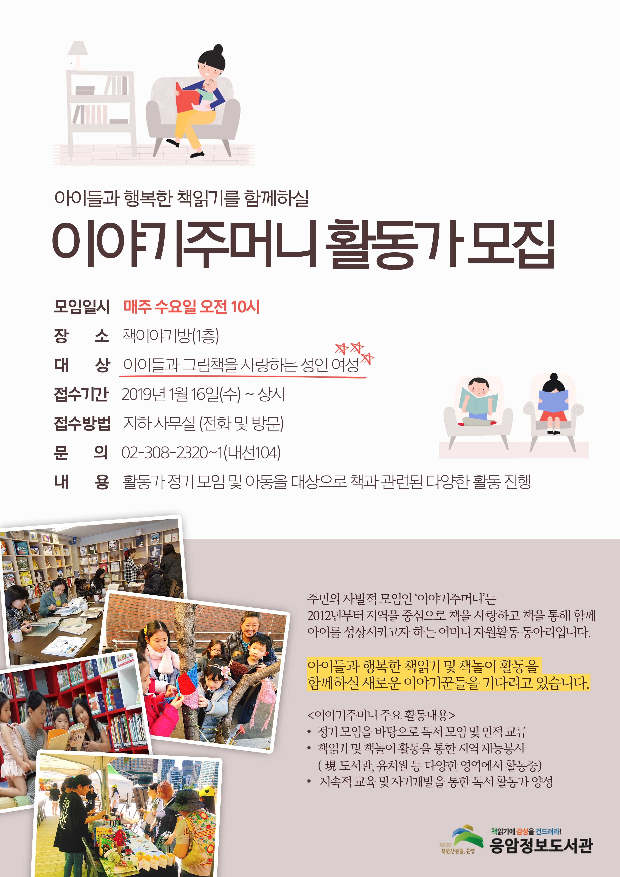 ¡®ÇÑ ÁÜÀÇ Ã߾¿Í ´õºÒ¾î ´Ù¾çÇÑ Ã¥ÀÐ±â ¹× Ã¥³îÀÌ È°µ¿À» ÁøÇàÇϰí ÀÖ´Â ¡®À̾߱âÁÖ¸Ó´Ï¡¯ÀÇ ½Å±Ô Ȱµ¿°¡¸¦ ¸ðÁýÇÑ´Ù. À̾߱âÁÖ¸Ó´Ï´Â ¸ÅÁÖ ¼ö¿äÀÏ Á¤±â ¸ðÀÓ°ú ÇÔ²² Áö¿ª ¾Æµ¿À» ´ë»óÀ¸·Î Ã¥Àбâ¿Í Ã¥³îÀÌ È°µ¿À» ÁøÇàÇϰí ÀÖ´Ù. ¾ÆÀÌ¿Í ÇÔ²² ±×¸²Ã¥À» »ç¶ûÇÑ´Ù¸é ´õÇÒ ³ªÀ§ ¾øÀÌ ÁÁÀº ¼±ÅÃÀÌ µÉ °ÍÀÌ´Ù.