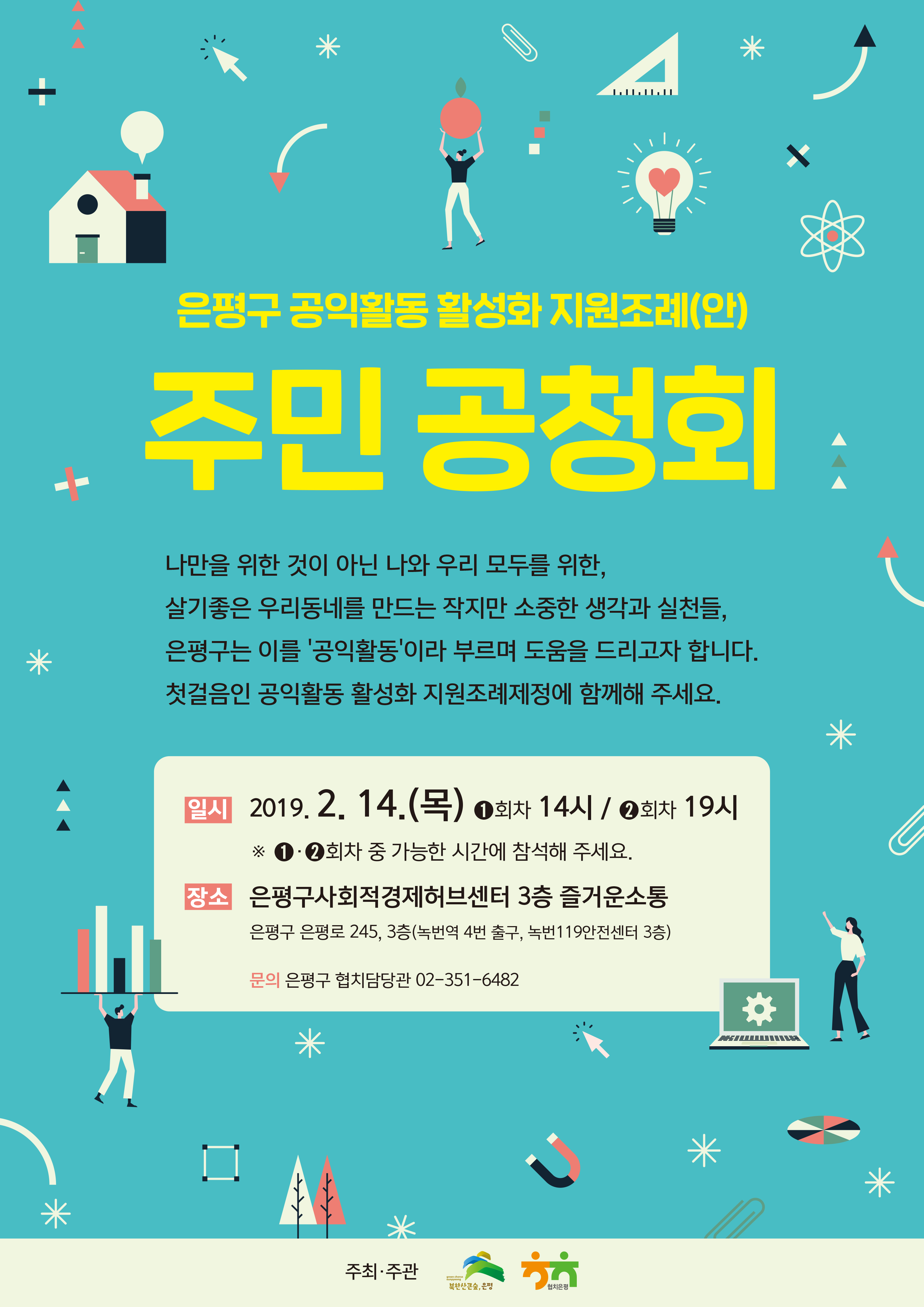 ÀºÆò±¸´Â ¿À´Â 2¿ù 14ÀÏ 14½Ã¿Í 19½Ã 2ȸ¿¡ °ÉÃÄ °øÀÍȰµ¿ Ȱ¼ºÈ Áö¿ø Á¶·Ê Á¦Á¤À» À§ÇØ Áö¿ª»çȸ ÀǰßÀ» ¼ö·ÆÇϴ¡¸ÀºÆò±¸ °øÀÍȰµ¿ Ȱ¼ºÈ Áö¿øÁ¶·Ê(¾È)¡¹ÁֹΰøÃ»È¸¸¦ ÀºÆò±¸ »çȸÀû°æÁ¦Çãºê¼¾ÅÍ 3Ãþ Áñ°Å¿î ¼ÒÅë¿¡¼ °³ÃÖÇÑ´Ù.