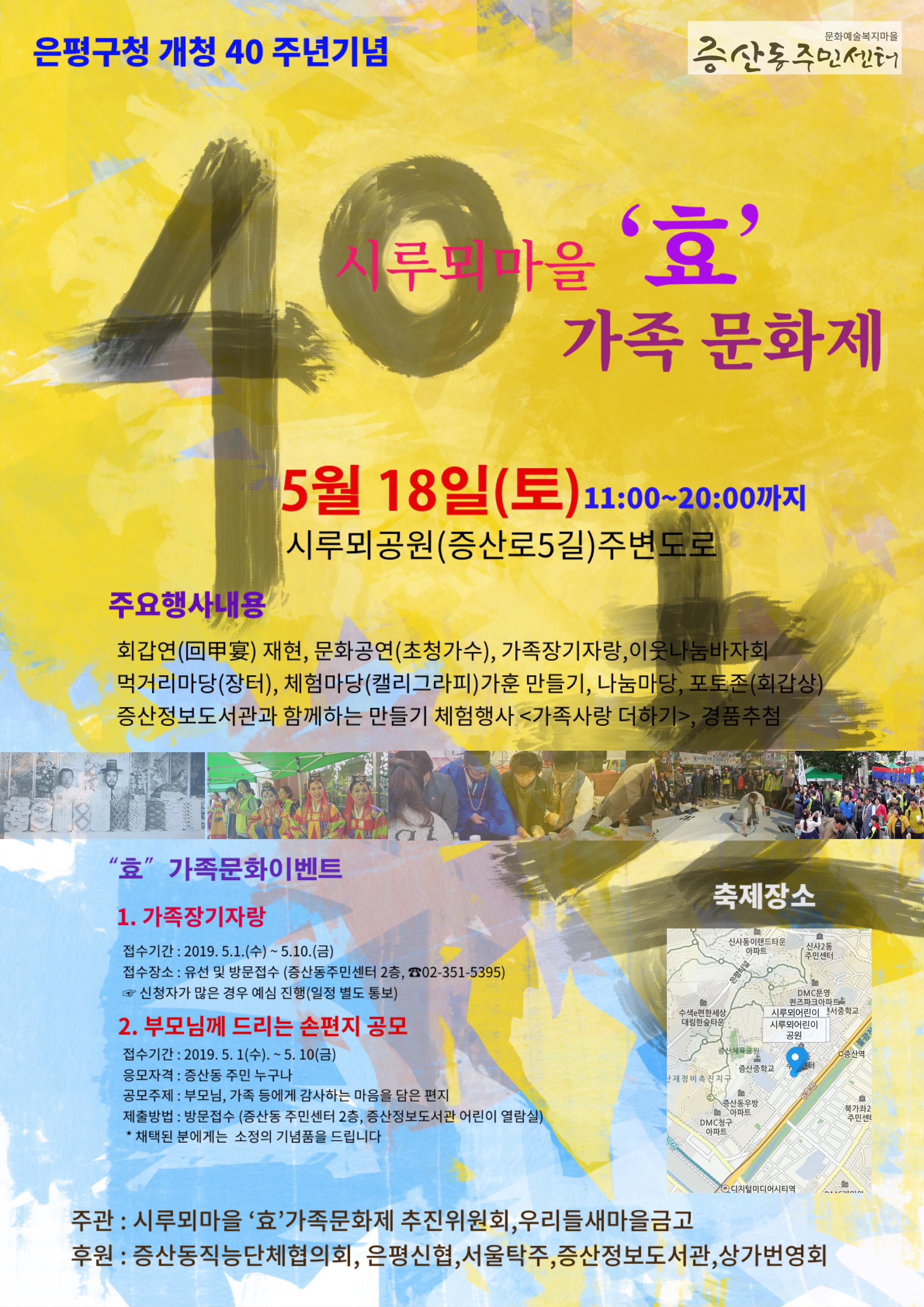 Áõ»êµ¿(µ¿Àå ÇѱԵ¿, ÃßÁøÀ§¿øÀå °Âù¼±)Àº ¿À´Â 2019³â 5¿ù 18ÀÏ Åä¿äÀÏ ¿ÀÀü 11½ÃºÎÅÍ ¿ÀÈÄ 8½Ã±îÁö ½Ã·ç¸þ°ø¿ø ÁÖº¯ µµ·Î¿¡¼ ¾î¸£½ÅµéÀ» ¸ð½Ã°í ÁֹεéÀÌ Á÷Á¢ ±âȹÇϰí Áñ±â´Â ¡®ÀºÆò±¸Ã» °³Ã» 40Áֳ⠱â³ä ½Ã·ç¸þ¸¶À» È¿(üø) °¡Á· ¹®ÈÁ¦¡¯¸¦ °³ÃÖÇÑ´Ù. À̳¯ Çà»ç°¡ ÁøÇàµÇ´Â µ¿¾È Áõ»êµµ¼°ü ⟷ ½Ã·ç¸þ°ø¿ø ⟷ µÎ»ê¾ÆÆÄÆ® »ó°¡ »ç°Å¸® ±¸°£Àº Â÷ ¾ø´Â °Å¸®·Î ¿î¿µÇÑ´Ù.