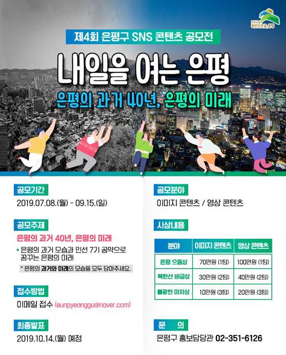 ¡®Á¦4ȸ ÀºÆò±¸ SNS ÄÜÅÙÃ÷ °ø¸ðÀü¡¯Àº ¡®³»ÀÏÀ» ¿©´Â ÀºÆò-ÀºÆòÀÇ °ú°Å 40³â, ÀºÆòÀÇ ¹Ì·¡¡¯¶ó´Â ÁÖÁ¦·Î ÀºÆò °ú°Å ¸ð½À¿¡¼ ¹Î¼±7±â °ø¾àÀ» ÅëÇØ ´Þ¶óÁú ÀºÆòÀÇ ¹Ì·¡ Èñ¸ÁÀ» À̹ÌÁö ÄÜÅÙÃ÷¿Í µ¿¿µ»ó ÄÜÅÙÃ÷·Î À̸ÞÀÏ(eunpyeonggu@naver.com)·Î Á¢¼öÇϰí ÀÖ´Ù.