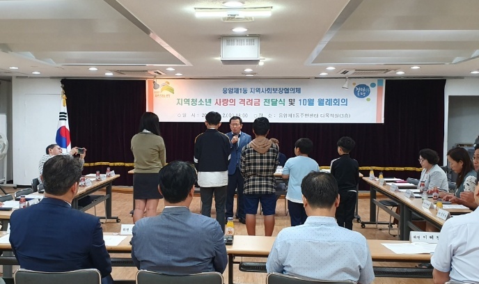 ÀÀ¾Ï1µ¿Áֹμ¾ÅÍ Áö¿ª»çȸº¸ÀåÇùÀÇü(µ¿Àå ¹Ú¼®±Ù,À§¿øÀåÁ¤¿Á¼ö)´Â 2019³â 10¿ù 2ÀÏ ÀÀ¾Ï1µ¿Áֹμ¾ÅÍ¿¡¼ ¡°Áö¿ªÃ»¼Ò³â »ç¶ûÀÇ °Ý·Á±Ý¡± Àü´Þ½ÄÀ» °¡Á³´Ù.