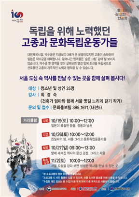 3Â÷ ÇÁ·Î±×·¥Àº ¡®°ÇÃà°¡ ¾ö¸¶¿Í ÇÔ²² ¼¿ï ¿¾±æ ´À¸®°Ô °È±â¡¯ ÃÖ°æ¼÷ ÀÛ°¡¸¦ ÃÊûÇÏ¿© ¡ã10¿ù 19ÀÏ ÀϺ»ÀÌ ÈÑöÇÑ ¶¥µé, Á¤µ¿°ú ³²»ê ¡ã10¿ù 26ÀÏ Ä£ÀÏÆÄÀÇ ¶¥, ¼ÃÌ ±×¸®°í ¹®Èµ¶¸³¿îµ¿°¡µé ¡ã10¿ù 27ÀÏ ¶¥¿¡ »õ°ÜÁø ¿ª»çÀÇ ¹®½Å °æ¼º, ±×¸®°í ¼¿ïÀ» ÁÖÁ¦·Î ¡®¼ûÀº ±×¸²¡¯ °°¾Æ Àß º¸ÀÌÁö ¾Ê´ø µµ½É ¼Ó ¿¾ ¿µ¿ªÀ» ã´Â °¿¬ ¹× ޹æÀ» ÁøÇàÇÒ ¿¹Á¤ÀÌ´Ù.