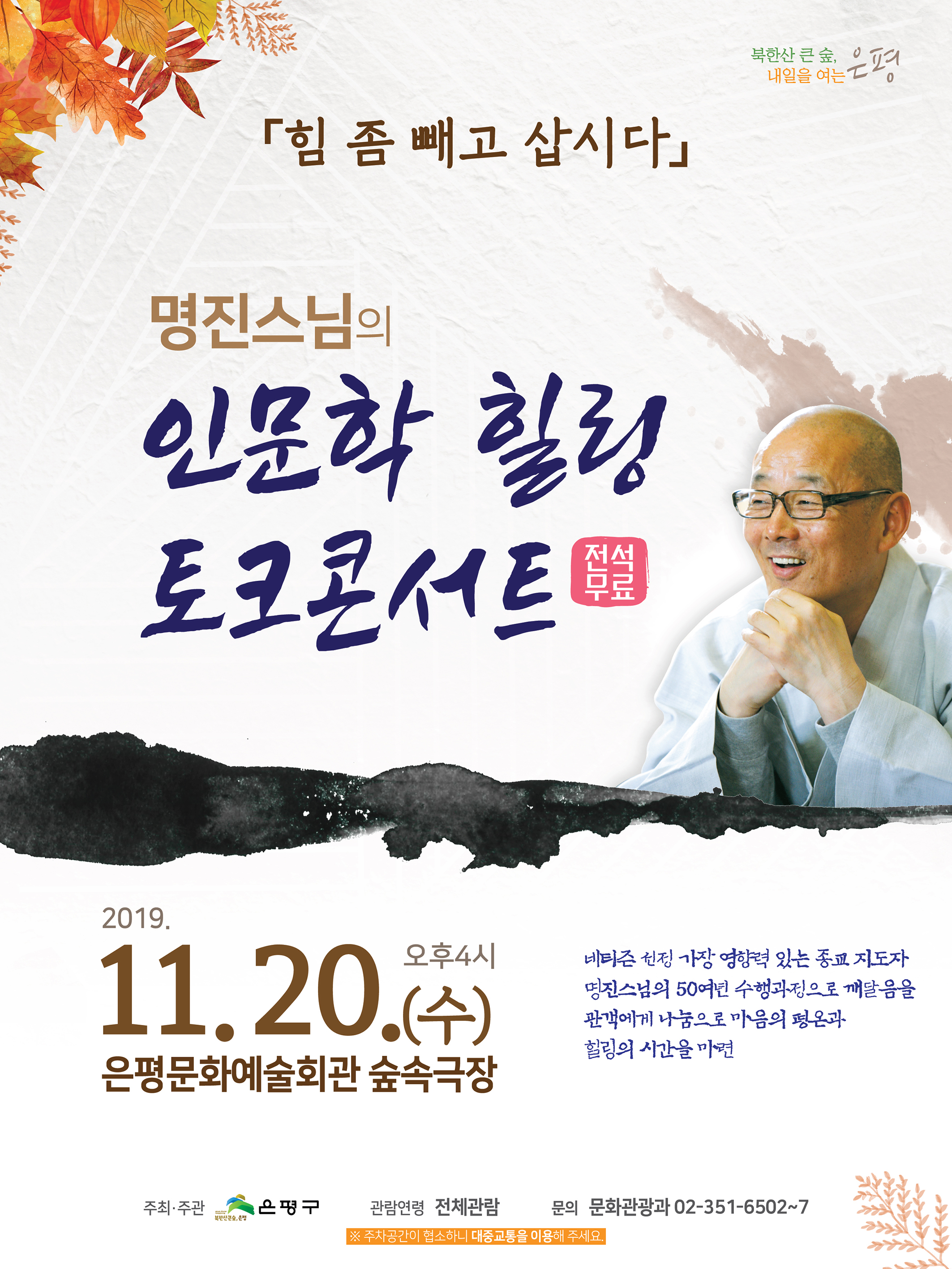ÀºÆò±¸¿¡¼´Â ¿À´Â 11¿ù 20ÀÏ ¿ÀÈÄ 4½ÃºÎÅÍ ÀºÆò¹®È¿¹¼úȸ°ü ½£¼Ó±ØÀå¿¡¼ »ç´Ü¹ýÀÎ ÆòÈÀDZæ ÀÌ»çÀåÀÎ ¸íÁø½º´ÔÀ» ¸ð½Ã°í Àι®ÇÐ Èú¸µ ÅäÅ©ÄܼƮ ¡¸Èû Á» »©°í »ð½Ã´Ù¡¹¸¦ °³ÃÖÇÑ´Ù°í ¹àÇû´Ù.