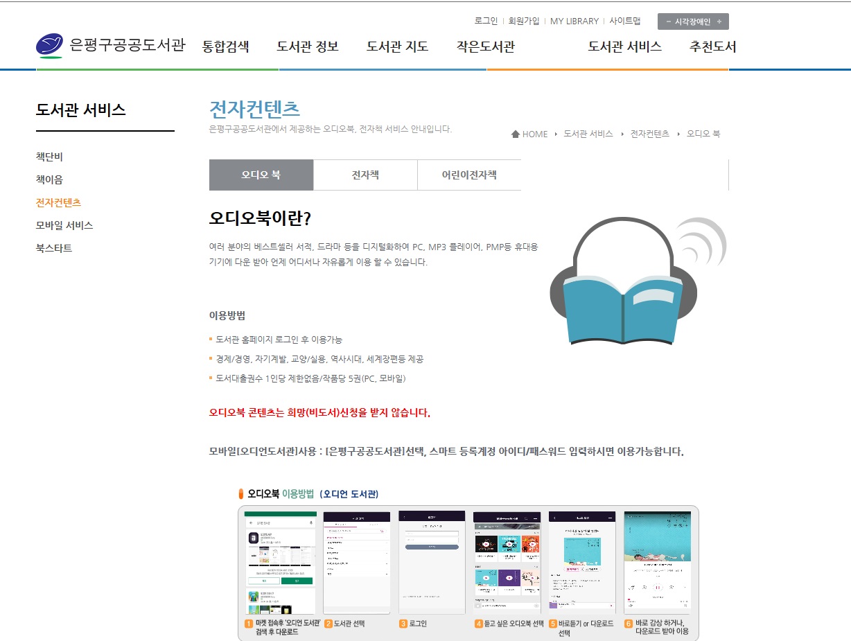 ¾Æ¿ï·¯ ÇöÀç ¿î¿µÁßÀÎ ¡®¿Àµð¿ÀºÏ¡¯Àº ÀºÆò±¸ °ø°øµµ¼°ü ¿Â¶óÀΠȸ¿øÀÌ¸é ´©±¸³ª PC, ¸ð¹ÙÀÏÀ» ÅëÇØ 800¿© °ÇÀÇ ¿Àµð¿ÀºÏÀ» ¸ðµÎ ÀÌ¿ëÇÒ ¼ö ÀÖÀ¸¸ç QRÄÚµå ÃÔ¿µÀ» ÅëÇØ ½º¸¶Æ®Æù ¾Û(app)À¸·Î ¼Õ½±°Ô ´Ù¿î¹Þ¾Æ ½Ã¡¤°ø°£ Á¦¾à ¾øÀÌ ÄÜÅÙÃ÷¸¦ ÀÌ¿ëÇÒ ¼ö ÀÖ´Ù. ÀÚ¼¼ÇÑ ÀÌ¿ë ¹æ¹ýÀº ÀºÆò±¸°ø°øµµ¼°üȨÆäÀÌÁö(lib.eplib.or.kr)ÀÇ ÀüÀÚÄÜÅÙÃ÷¿¡¼ È®ÀÎ ÇÒ ¼ö ÀÖ´Ù.