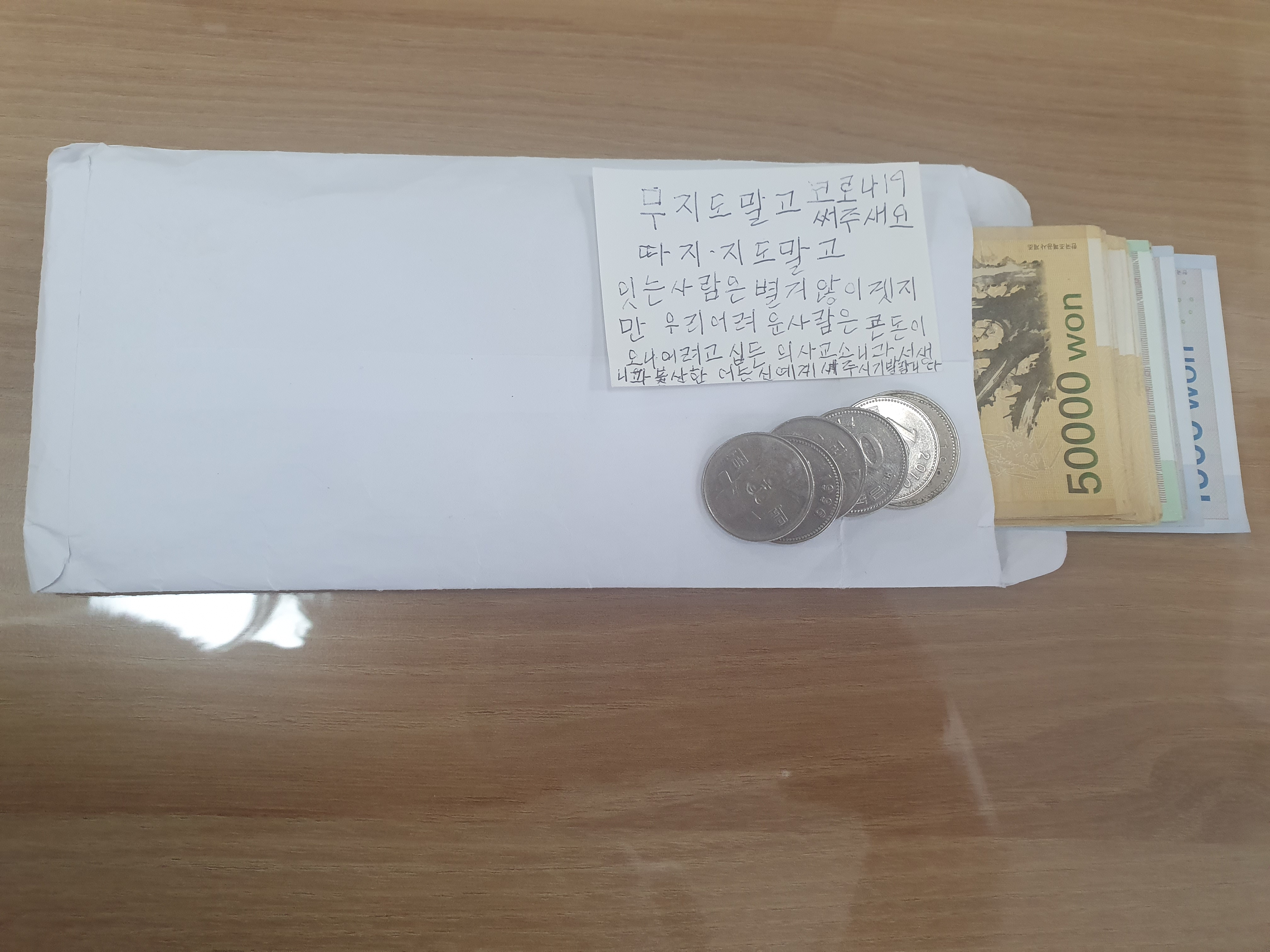 ¾î¸£½ÅÀÌ ³²±ä ºÀÅõ ¼Ó¿¡´Â ¡°¹¯Áöµµ ¸»°í µûÁöÁöµµ ¸»°í Äڷγª19 ½áÁÖ¼¼¿ä. ÀÖ´Â »ç¶÷Àº º°°Å ¾Æ´Ï°ÚÁö¸¸ ¿ì¸® ¾î·Á¿î »ç¶÷Àº Å«µ·ÀÌ¿À´Ï ¾î·Æ°í Èûµç ÀÇ»ç ±³¼ö´Ô°ú ¼±»ý´Ô°ú ºÒ½ÖÇÑ ¾î¸£½Å¿¡°Ô ½á Áֽñ⠹ٶø´Ï´Ù¡±¶õ ¼Õ±Û¾¾·Î ¾²ÀÎ Àڱ׸¶ÇÑ ÂÊÁö¿Í ÁöÆó¿Í µ¿Àü 743,000¿øÀÌ µé¾îÀÖ¾ú´Ù.