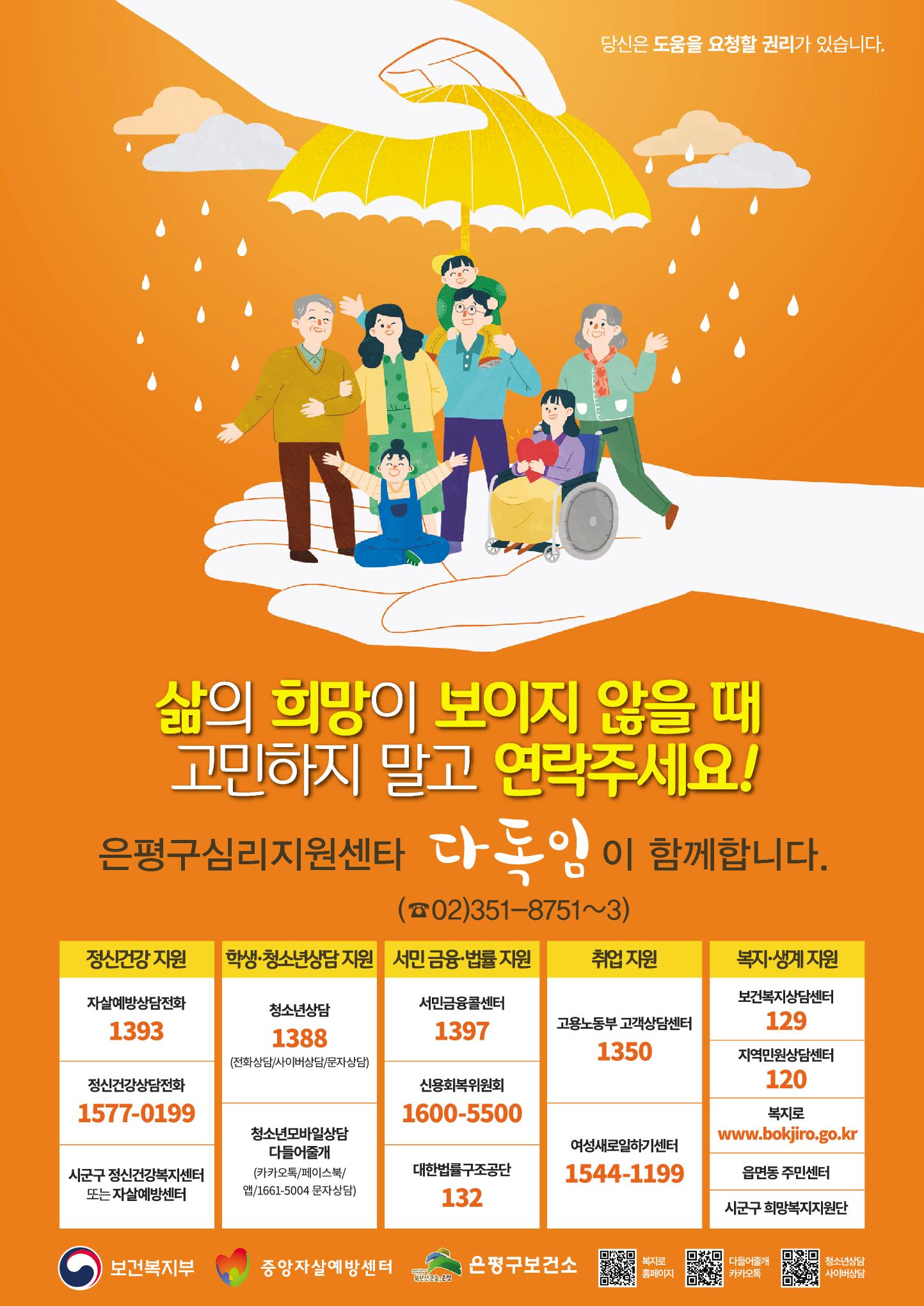 ÇÑÆí ÀºÆò±¸´Â ¿ì¿ïÇϰųª ½É¸®Àû ¾î·Á¿òÀ» °Þ°í ÀÖ´Â Áö¿ªÁÖ¹ÎÀÌ »ó½Ã »ó´ã¼ºñ½º¸¦ ¹«·á·Î ¹ÞÀ» ¼ö ÀÖµµ·Ï ½É¸®Áö¿ø¼¾ÅÍ ¡®´Ùµ¶ÀÓ¡¯(¢Ï351-8751)À» ¿î¿µÇϰí ÀÖ´Ù.