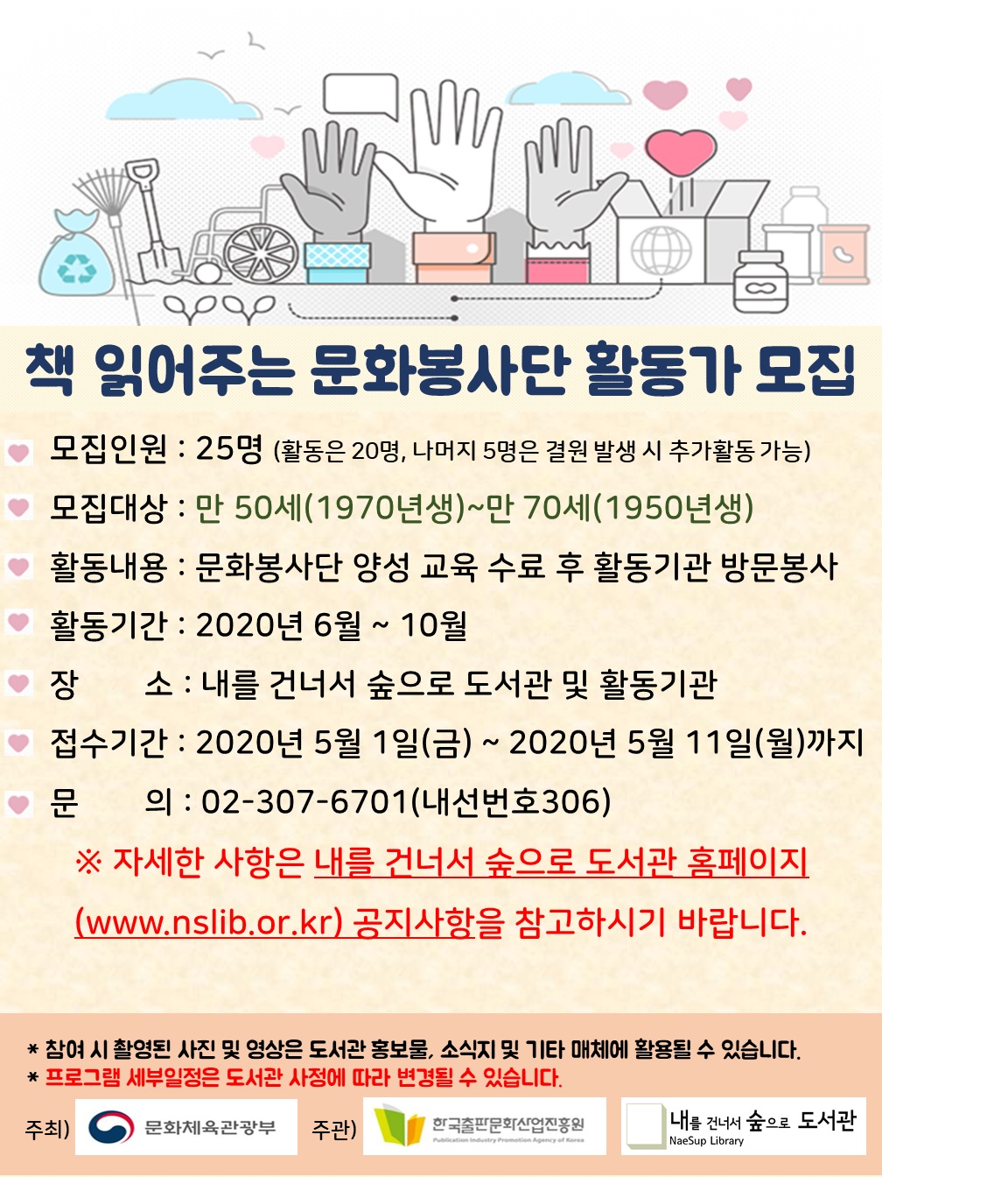 ³»¸¦°Ç³Ê¼½£À¸·Îµµ¼°üÀº ¼¿ïÁö¿ª 20°³ÀÇ ¾Æµ¿¡¤³ëÀΡ¤Àå¾ÖÀÎ µîÀÇ ±â°ü¿¡ 20¸íÀÇ È°µ¿°¡¸¦ ÆÄ°ßÇÏ¿© Ã¥ ÀоîÁÖ´Â µîÀÇ ¹®È ºÀ»çȰµ¿À» ÁøÇàÇÑ´Ù. ¹æ¹® Ȱµ¿±â°£Àº 2020³â 7¿ù~10¿ù(Æø¿°±â°£ 8¿ù Á¦¿Ü)À̸ç 5¿ù 15ÀÏ(±Ý)±îÁö ¹æ¹®À» ¿øÇÏ´Â ±â°üÀ» ¸ðÁýÇÒ °èȹÀÌ´Ù.