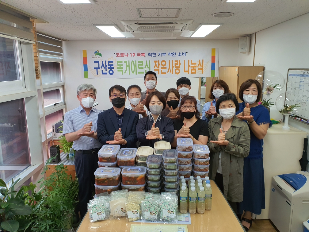 ±¸»êµ¿ Á÷¿øµéÀÌ ÀÛÀº ¼º±ÝÀ» ¸¶·ÃÇÏ¿© Äڷγª19·Î ¾î·Á¿òÀ» °Þ°í ÀÖ´Â Àú¼Òµæ µ¶°Å¾î¸£½Å 30ºÐ²² 4°¡Áö ¹Ø¹ÝÂù(Àâä, ÀåÁ¶¸², ÄÚ´Ù¸®Á¶¸², Á¶°³Á£°¥)°ú »õ¸¶À»ºÎ³àȸ¿¡¼ Á÷Á¢ ´ã±Ù ¾ó°¥À̱èÄ¡¿Í Çϰè¿ë ¸¶½ºÅ©, ÃÊ¿øÂù¹æ(´ëÇ¥ ±èÁ¤ÀÚ)¿¡¼ ±âºÎÇØÁֽŠºÒ°í±â¿Í ½ÄÇý¸¦ Àü´ÞÇß´Ù. Äڷγª19·Î ÀÎÇØ ±× µ¿¾È Áö¿øÀÌ ÁߴܵǾú´ø ¹Ø¹ÝÂùÀ» Àü´ÞÇÔÀ¸·Î½á ¾î¸£½ÅµéÀÇ °ÆÁ¤À» ´ú¾îµå¸®°Ô µÇ¾ú´Ù.