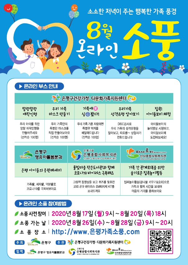 ÀºÆò±¸°Ç°°¡Á¤¡¤´Ù¹®È°¡Á·Áö¿ø¼¾ÅÍ¿¡¼ ÁÖ°üÇÏ´Â ¡®¿Â¶óÀÎ ¼Òdz¡¯Àº 8¿ù ÆÄÆ®³ÊÀÎ ÀºÆò±¸ ¿µÀ¯¾Æµ¹º½ºÐ°ú, ÀºÆòÁ¾ÇÕ»çȸº¹Áö°ü, ½Å»çÁ¾ÇÕ»çȸº¹Áö°ü°ú Çù·ÂÇÏ¿© ¡ã°¡Á· D.I.Y.Ȱµ¿(¾ÖÂøÀÎÇü, ¸¶½ºÅ© Á¦ÀÛ)°ú ¡ã°¡Á·äñ ãýºÃ´Ù(°¡Á· °¡ÈÆ ¾×ÀÚ) ¡ã¿ì¸®°¡Á· ¼º°ÝÀ¯Çü ¾Ë¾Æº¸±â(DISC°Ë»ç) ¡ã±×¸²Ã¥ µ¿¿µ»ó ÄûÁî ¡ã½½±â·Î¿î ÁýÄÛ³îÀÌȰµ¿(Äᳪ¹° Ű¿ì±â µî) µî Àü °¡Á·ÀÌ Âü¿©ÇÒ ¼ö ÀÖ´Â ÇÁ·Î±×·¥À¸·Î ±¸¼ºµÇ¾ú´Ù.