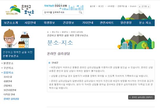 ¿Â¶óÀÎ ½É¸®»ó´ã ¼ºñ½º´Â ÀºÆò±¸Ã» ȨÆäÀÌÁö³ª ÀºÆò±¸ º¸°Ç¼Ò ȨÆäÀÌÁö¸¦ ÅëÇØ¼ ÀÌ¿ëÇÒ ¼ö ÀÖÀ¸¸ç ÀºÆò±¸ ½É¸®Áö¿ø¼¾ÅÍ ´Ùµ¶ÀÓ(02-351-8751~3)À¸·Î ¹®ÀÇÇÒ ¼ö ÀÖ´Ù.