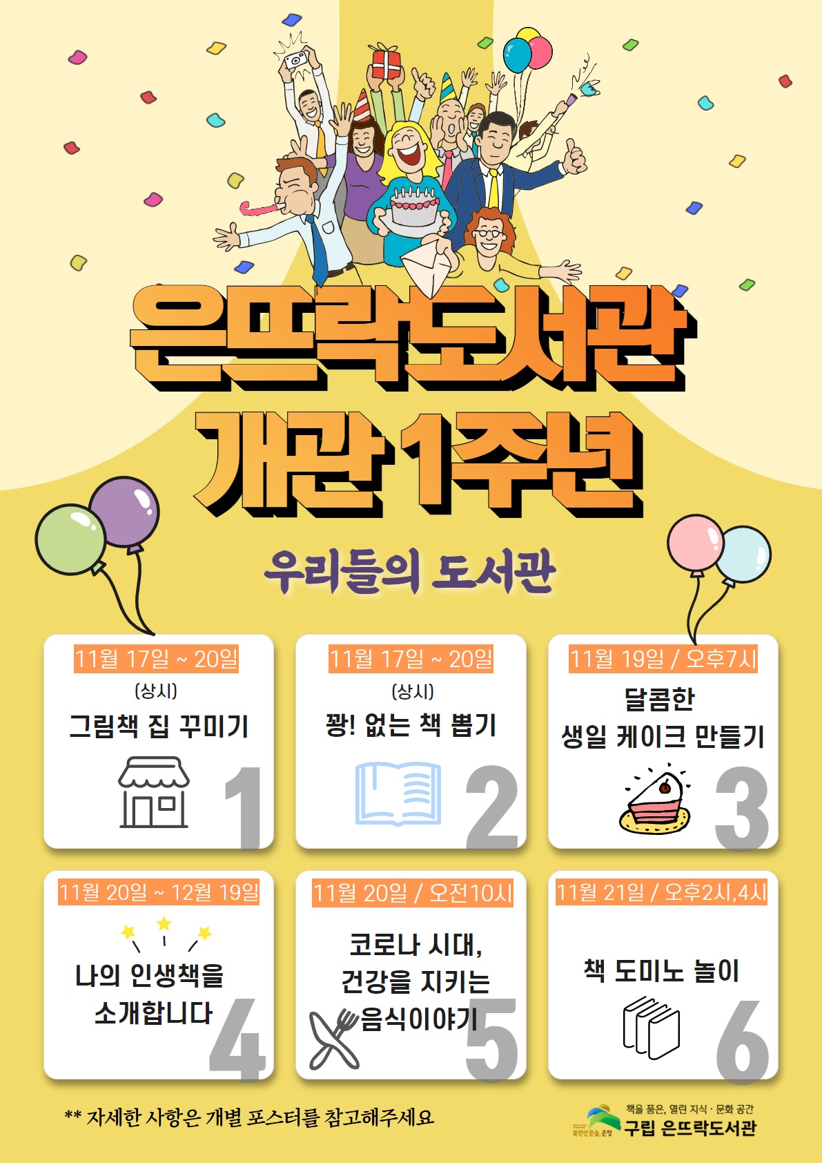 ±¸¸³ Àº¶ß¶ôµµ¼°üÀÌ 2020³â 11¿ù 20ÀÏ) °³°ü 1ÁÖ³âÀ» ¸ÂÀÌÇÏ¿© 11¿ù 17ÀÏ)ºÎÅÍ 11¿ù 21ÀϱîÁö ±¸¹Î°ú ÇÔ²²ÇÏ´Â ´Ù¾çÇÑ µ¶¼‧¹®È ÇÁ·Î±×·¥À» ¿Â¶óÀÎ ºñ´ë¸é ¹æ½ÄÀ¸·Î °³°ü 1ÁÖ³âÀ» ÃàÇÏÇÏ´Â ±â³äÇà»ç¸¦ ÁøÇàÇÑ´Ù°í ¹àÇû´Ù. ÀºÆò±¸ °ü³» ¿©´ü ¹øÂ° µµ¼°üÀÎ ¡®±¸¸³ Àº¶ß¶ô µµ¼°ü¡¯Àº Áö³ÇØ 11¿ù Áø°üµ¿¿¡ ¹®À» ¿¾î ¿¬¸éÀû 1,075§³, Áö»ó 3Ãþ ±Ô¸ð¿¡ Á¾ÇÕÀÚ·á½Ç, ¾î¸°ÀÌ ÀÚ·á½Ç, ÀÛ°¡ÀÇ ¹æ, ²Þ¶ß¶ô °ø°£ µîÀ¸·Î Á¶¼ºµÆ´Ù. °³°ü 1ÁÖ³â ÇÁ·Î±×·¥À¸·Î Äڷγª19 ½Ã´ë¿¡ °Ç°ÇÑ ¸Ô°Å¸®¿Í ÇѽĿ¡ ´ëÇØ À½½ÄÆò·Ð°¡ ÀÌ¿ëÀç ¼±»ý´ÔÀÇ °¿¬(Äڷγª½Ã´ë °Ç°À» ÁöŰ´Â À½½Ä À̾߱â)°ú ´õºÒ¾î 11¿ù 20ÀÏÀÌ »ýÀÏÀÎ ÀÌ¿ëÀÚ¿Í ÇÔ²² ¡®ÄÉÀÌÅ© ¸¸µé±â¡¯, ¡®²Î! ¾ø´Â Ã¥ »Ì±â¡¯, ¡®Ã¥ µµ¹Ì³ë³îÀÌ¡¯, ¡®±×¸²Ã¥ Áý ¸¸µé±â¡¯ µîÀ» ÁøÇàÇÑ´Ù. ƯÈ÷ ¡®³» ÀλýÀÇ Ã¥À» ¼Ò°³ÇÏ´Ù¡¯´Â ÀÌ¿ëÀÚ°¡ Á÷Á¢ µµ¼¸¦ ÃßõÇϰí Àü½Ã°ø°£À» ²Ù¸ç ÇÑ´Þ°£(11.20.~12.19.) Àü½ÃÇÏ´Â ÇÁ·Î±×·¥À¸·Î ÁøÇàÇÒ ¿¹Á¤ÀÌ´Ù. ½ÅÁ¾Äڷγª¹ÙÀÌ·¯½º °¨¿°Áõ(Äڷγª19)È®»ê ¹æÁö¸¦ À§ÇØ ¸¹Àº Áö¿ªÁֹΰú ÇÔ²² ´ë¸éÀ¸·Î ¡®°³°ü 1Áֳ⠱â³ä½Ä¡¯À» ÇÒ ¼ö ¾øÁö¸¸ ¿Â¶óÀÎ ÃàÇÏ Àλç¿Í ºñ´ë¸éÀ» ÅëÇÑ ´Ù¾çÇÑ ÇÁ·Î±×·¥À» ÁغñÇÏ¿´´Ù. ±è¹Ì°æ ÀºÆò±¸Ã»ÀåÀº ¡°±¸¹ÎµéÀÇ °ü½É°ú Àû±ØÀûÀÎ Âü¿©·Î ±¸¸³Àº¶ß¶ôµµ¼°üÀÌ °³°ü 1³â ¸¸¿¡ ¸ðµÎ¸¦ À§ÇÑ ¹®È°ø°£À¸·Î ÀÚ¸®Àâ¾Ò´Ù¡±¸ç ¡°ÇâÈÄ¿¡µµ ´Ù¾çÇÑ ¹®ÈÇÁ·Î±×·¥À» ¹ß±¼ÇØ Áֹε鿡°Ô ´Ù°¡°¡¸ç ÇÔ²² ¼ºÀå ÇÒ ¼ö ÀÖ´Â µµ¼°üÀÌ µÇµµ·Ï ³ë·ÂÇϰڴ١±°í ¸»Çß´Ù. ÀÚ¼¼ÇÑ »çÇ×Àº Àº¶ß¶ôµµ¼°ü(¢Ï02-389-7635)¿¡ ¹®ÀǸ¦ ÅëÇÏ¿© È®ÀÎÇÒ ¼ö ÀÖ´Ù.
