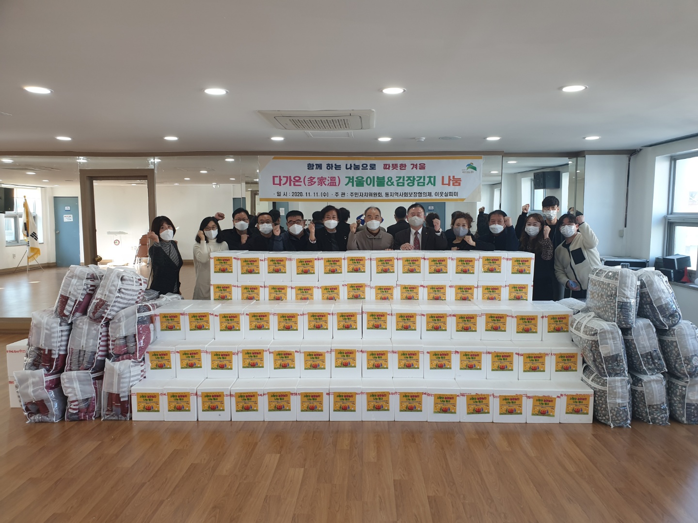 ´ëÁ¶µ¿ Áֹμ¾ÅÍ(µ¿Àå À¯Çö¼÷)´Â ÁÖ¹ÎÀÚÄ¡À§¿øÈ¸(À§¿øÀå ±èÀͳ²) ¹× µ¿Áö¿ª»çȸº¸ÀåÇùÀÇü, ÀÌ¿ô»ìÇÇ¹Ì¿Í ÇÔ²² 2020³â 11¿ù 11ÀÏ(¼ö) µ¿Àý±â¸¦ ¸ÂÀÌÇÏ¿© Àú¼Òµæ Ȧ¸ö¾î¸£½Å°ú Áß¡¤Àå³â 1ÀÎ °¡±¸¿¡°Ô ¡°´Ù°¡¿Â(ÒýÊ«è®)±èÀå±èÄ¡&°Ü¿ïÀÌºÒ ³ª´®¡± Çà»ç¸¦ ½Ç½ÃÇÏ¿´´Ù. À̳¯ ´ëÁ¶µ¿ ÁÖ¹ÎÀÚÄ¡À§¿øÈ¸ ¹× µ¿Áö¿ª»çȸº¸ÀåÇùÀÇü À§¿ø°ú ÀÌ¿ô»ìÇǹ̴ ÀڸŰῬÁö ¾Èµ¿¿¡¼ Á÷Á¢ Àç¹èÇÑ ½Ì½ÌÇÑ ±¹³»»ê ±èÄ¡(5kg)¿Í °¡º±°í Æ÷±ÙÇÑ °Ü¿ïÀ̺ÒÀ» °ü³» °íµ¶»ç Ãë¾à°¡±¸ ¹× °Åµ¿ºÒÆí ¾î¸£½Å 200°¡±¸¿¡ Àü´ÞÇÏ¸ç ¾ÈºÎ¸¦ È®ÀÎÇϰí, µû¶æÇÑ ¸¶À½À» ³ª´©¾ú´Ù. ÁÖ¹ÎÀÚÄ¡À§¿øÈ¸(À§¿øÀå ±èÀͳ²)Àº ¡°¾î¸£½ÅµéÀÌ ±èÀå±èÄ¡¿Í À̺ÒÀ» ¹Þ°í Èå¹µÇØ ÇÏ´Â ¸ð½ÀÀ» º¸¸ç º¸¶÷À» ´À²¼´Ù.¡±¸ç ¡°¾ÕÀ¸·Îµµ ´Ù¾çÇÑ ³ª´® Ȱµ¿À» ÅëÇØ ¼Ò¿Ü°èÃþÀ» µ½°í, Áö¿ª ³ª´® ½Çõ¿¡ ¾ÕÀå¼°Ú´Ù.¡°°í ¸»Çß´Ù. ´ëÁ¶µ¿ Áö¿ª»çȸº¸ÀåÇùÀÇü(À§¿øÀå ÇÑ¿µ)´Â ¡°º»°ÝÀûÀÎ ÃßÀ§¿Í Àü·Ê ¾ø´Â Äڷγª19·Î ¾ó¾î ºÙÀº Áö¿ª»çȸ¿¡ µû¶æÇÑ ¿Â±â¸¦ ³ª´©°íÀÚ À̹ø ³ª´®À» ÃßÁøÇÏ°Ô µÇ¾ú´Ù¡±¸ç ¾ÕÀ¸·Îµµ "Áö¿ª ³» Ãë¾à°èÃþ°ú ¾î¸£½ÅµéÀÌ µû¶æÇϰí ÇູÇÑ °Ü¿ïÀ» º¸³¾ ¼ö ÀÖµµ·Ï ¾Æ³¦¾ø´Â Áö¿øÀ» ÇϰڴÙ."°í ÀüÇß´Ù.