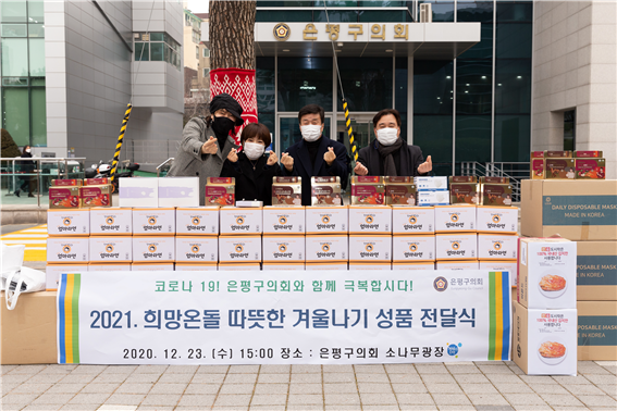 ÀºÆò±¸ÀÇȸ(ÀÇÀå ¹Ú¿ë±Ù)´Â Áö³ 12¿ù 23ÀÏ, ±¸ ÀÇȸµ¿ ¾Õ ¼Ò³ª¹«±¤Àå¿¡¼ Æò¼Ò ±âºÎõ»ç·Î ³Î¸® ¾Ë·ÁÁ® ÀÖ´Â °¡¼ö ±èÀåÈÆ, °³±×¿ì¸Õ Á¶Çý·Ã¾¾·ÎºÎÅÍ ¶ó¸é 1,200°³, ¸¶½ºÅ© 6,000°³, ÇÚµåÅ©¸² 144°³, °Ç°º¸Á¶½Äǰ 100°³, ±èÄ¡ 300Æ÷±â¸¦ ¡®µû¶æÇÑ °Ü¿ï³ª±â ¼ºÇ°¡¯À¸·Î Àü´Þ¹Þ¾Ò´Ù.