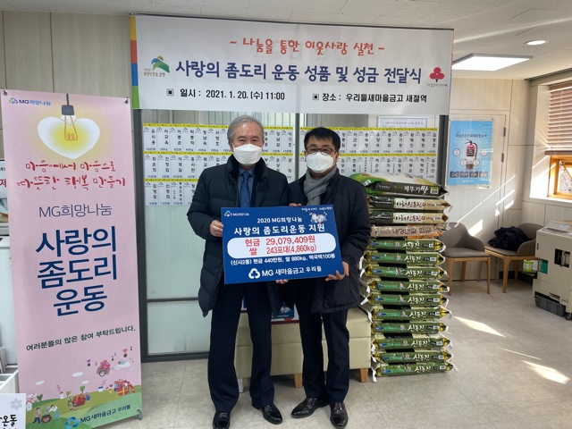 Áö³ 1¿ù20ÀÏ ÀºÆò±¸ ¿ì¸®µé»õ¸¶À»±Ý°í »õÀý¿ªÁöÁ¡(ÀÌ»çÀå ÀÌ¿µÁø)¿¡¼´Â ½Å»ç2µ¿ Áֹμ¾ÅÍ(µ¿Àå ÀÌ¿ëÈñ)¸¦ ÅëÇØ ÀÌ¿ô »ç¶û ³ª´®À» ½ÇõÇÏ¿´´Ù. °ü³» ÇѺθð°¡Á¤ 44°¡±¸¿¡´Â Çö±Ý Áö¿ø 10¸¸ ¿ø°ú 20kg ¹é¹Ì 1Æ÷¸¦, Ȧ·Î »ç´Â ¾î¸£½Å 100¸í¿¡°Ô´Â ¼³¸ÂÀÌ ¶±±¹ ¶±À» Àü´ÞÇÏ¿´´Ù.