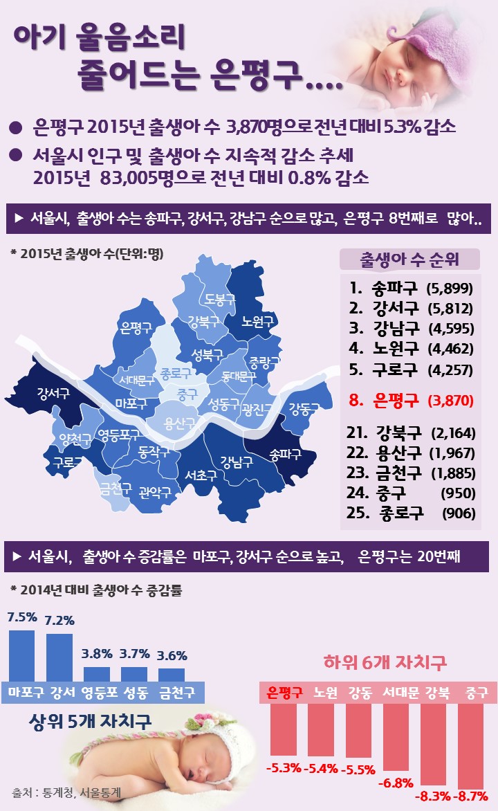 ÀºÆò±¸´Â Ãâ»ý ÇöȲÀ» ¿¬µµº° ¡¤ »ê¸ð ¿¬·É´ëº° ¡¤ Áö¿ªº° µîÀ¸·Î ºÐ¼®, ½Ã°¢ÈÇØ ¡¸ÀºÆò ÀÎÆ÷±×·¡ÇȽº 4È£¡¹¸¦ Á¦ÀÛ ¡¤ ¹ßÇ¥ÇÏ¿´´Ù.¹ßÇ¥µÈ ³»¿ëÀ» º¸¸é ÀºÆò±¸ÀÇ Ãâ»ý¾Æ ¼ö´Â 2015³â 3,870¸íÀ¸·Î 2014³â 4,085¸í ´ëºñ 5.3% °¨¼ÒÇß´Ù. ÀÌ °°Àº Ãâ»ý¾Æ ¼ö´Â ¼¿ï½Ã ÀÚÄ¡±¸ Áß 8¹øÂ°·Î ¸¹À¸³ª, Ãâ»ý¾Æ¼ö Áõ°¨·üÀº ÀÚÄ¡±¸ 20¹øÂ°¿¡ ÇØ´çµÈ´Ù. Àα¸ ¹× Ãâ»ý¾Æ ¼ö´Â ÀºÆò±¸»Ó ¾Æ´Ï¶ó ¼¿ï½Ã ÀÚÄ¡±¸µéµµ °¨¼Ò¼¼¸¦ º¸À̰í ÀÖ´Ù. ¿ì¸®³ª¶óÀÇ 2015³âµµ ÇÕ°èÃâ»êÀ²(°¡ÀÓ¿©¼º 1¸íÀÌ Æò»ý µ¿¾È ³ºÀ» °ÍÀ¸·Î ¿¹»óµÇ´Â Æò±Õ Ãâ»ý¾Æ¼ö)Àº 1.24¸íÀ̸ç ÀºÆò±¸´Â 1.0¸íÀ¸·Î ¼¿ï½Ã ÀÚÄ¡±¸ Áß 15¹øÂ°¿¡ ÇØ´çµÇ¸ç ¼¿ï½ÃÀÇ ÇÕ°èÃâ»êÀ²Àº 1.0¸í, ±¸·Î±¸°¡ 1.17¸íÀ¸·Î °¡Àå ³ô¾Ò°í, °³²±¸°¡ 0.86¸íÀ¸·Î °¡Àå ³·°Ô ³ªÅ¸³µ´Ù.¶ÇÇÑ »ê¸ðÀÇ Ã¹Â°¾Æ Ãâ»ý¿¬·ÉÀº 2010³â 30.9¼¼¿¡¼ 2015³â 32.0¼¼·Î ³ô¾ÆÁ® ù°¾Æ¸¦ ³º´Â ¿©¼ºÀÇ ³ªÀ̰¡ °¥¼ö·Ï ³ô¾ÆÁ® °¡°í ÀÖ´Â °ÍÀ¸·Î ³ªÅ¸³µ´Ù.ÀºÆò±¸´Â À̹ø Ãâ»ý ÇöȲ ºÐ¼® ÀڷḦ Àú Ãâ»ê, °í·ÉÈ, Àα¸°¨¼Ò µîÀÇ ¹®Á¦ÇذáÀ» À§ÇÑ Á¤Ã¥ ÀÚ·á·Î Ȱ¿ëÇÏ¿© ±¸Á¤ Çö¾ÈÀ» ÇØ°áÇØ ³ª°¥ °ÍÀ̶ó°í ¹àÇû´Ù.ÇÑÆí ÀºÆò±¸´Â Áö³ 2¿ù ÀºÆò±¸ 1ÀÎ °¡±¸(1È£)¸¦ ºÐ¼®ÇÑ ÀÎÆ÷±×·¡ÇÈ Á¦ÀÛÀ» ½ÃÀÛÀ¸·Î °í·ÉÀα¸ÆÄ¾Ç(2È£), ÀüÃâÀÔ À̵¿ Àα¸ ÇöȲ(3È£)ÀڷḦ ¹ßÇ¥ÇÏ¿´´Ù.