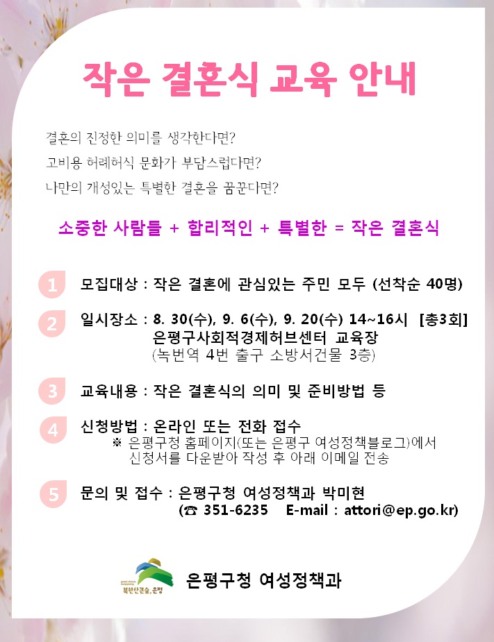 ÀºÆò±¸, ÇÕ¸®ÀûÀÌ°í °³¼º ÀÖ´Â ÀÛÀº °áÈ¥½Ä ÁֹΠ±³À° ½Ç½Ã ÀºÆò±¸´Â Çã·ÊÇã½Ä°ú °íºñ¿ëÀÇ È¥·Ê¹®È·Î ÀÎÇÑ ºñÈ¥‧ÀúÃâ»ê µî »çȸ¹®Á¦¿¡ Àû±Ø ´ëÀÀÇϱâ À§ÇÏ¿© ÀÌ´Þ 30ÀϺÎÅÍ ÀºÆò±¸ »çȸÀû°æÁ¦Çãºê¼¾ÅÍ¿¡¼ ¡®ÀÛÀº °áÈ¥½Ä ÁֹΠ±³À°¡¯À» ½Ç½ÃÇÑ´Ù. Àå±âÈµÈ °æ±âºÒȲ ¹× û³â½Ç¾÷À¸·Î ÀÎÇØ °áÈ¥ ºñ¿ë¿¡ ´ëÇÑ °æÁ¦Àû ‧ ½É¸®Àû ºÎ´ãÀÌ Áõ°¡ÇÔ°ú ÇÔ²² ÃÖ±Ù À¯¸í ¿¬¿¹ÀεéÀÇ ÀÛÀº °áÈ¥ ½Çõ »ç·Ê°¡ ´Ã¾î³²¿¡ µû¶ó ÀÛÀº °áÈ¥½Ä¿¡ ´ëÇÑ ÁÖ¹ÎÀÇ °ü½ÉÀÌ ³¯·Î ³ô¾ÆÁö°í ÀÖ´Â ½ÇÁ¤ÀÌ´Ù. ÀºÆò±¸´Â ´Ü¼øÈ÷ ºñ¿ëÀ» ÃÖ¼ÒÈÇϰí ÀýÂ÷¸¦ »ý·«Çعö¸° ±Ô¸ð¸¸ ÀÛÀº °áÈ¥½ÄÀÌ ¾Æ´Ï¶ó Çã·ÊÇã½ÄÀ» ¹þ¾î³ª È¥·ÊÀÇ ÁøÁ¤ÇÑ Àǹ̸¦ µÇ»ì¸®°í °áÈ¥´ç»çÀÚÀÇ °³¼ºÀ» »ì·Á Ưº°ÇÑ °áÈ¥½ÄÀ» ÁغñÇÒ ¼ö ÀÖµµ·Ï ÃÑ 3ȸ¿¡ °ÉÃÄ ±³À°À» Çϸç, Àü¹®°¡ÀÇ ÀÛÀº °áÈ¥½Ä »ç·Ê °øÀ¯¿Í ÁúÀÇÀÀ´äÀ» ÅëÇØ ÁֹεéÀÇ ±Ã±ÝÇÑ Á¡À» ÇØ¼ÒÇÒ ¿¹Á¤ÀÌ´Ù. ƯÈ÷ À̹ø ±³À°Àº 2017³â ¼¿ï½Ã ½Ã¹ÎÂü¿©Á¦¾È»ç¾÷ÀÎ ¡®Ã»³âµµÀü ÇÁ·ÎÁ§Æ®¡¯¿¡ °ø¸ð ¼±Á¤µÇ¾î ¡®ÀºÆòÇü ÀÛÀº°áÈ¥½Ä(¸¶À»°áÈ¥½Ä)¡¯À» ÃßÁøÇϰí ÀÖ´Â ¡¸Çùµ¿Á¶ÇÕ Ã»Ã»¡¹°ú ÇÔ²² ÁغñÇÏ¿© ÀÛÀº °áÈ¥½Ä¿¡ ´ëÇÑ º¸´Ù ¾ËÂù Á¤º¸¸¦ ¾òÀ» ¼ö ÀÖÀ» °ÍÀ¸·Î ±â´ëµÈ´Ù. ÀÛÀº °áÈ¥¿¡ °ü½É ÀÖ´Â ÁÖ¹ÎÀÌ¸é ¿Â¶óÀÎÀ̳ª ÀüÈÁ¢¼ö¸¦ ÅëÇØ ´©±¸³ª Âü¿©ÇÒ ¼ö ÀÖÀ¸¸ç ÀÚ¼¼ÇÑ »çÇ×Àº ÀºÆò±¸ ¿©¼ºÁ¤Ã¥ºí·Î±×(http://blog.naver.com/eunpyeong_women)¸¦ ÅëÇØ È®ÀÎÇÒ ¼ö ÀÖ´Ù.