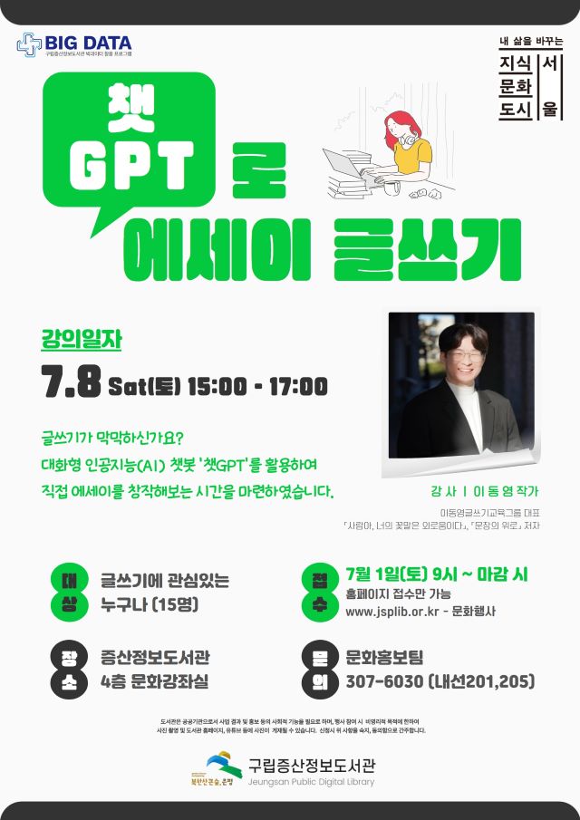 [21ÀºÆò´º½º=¿ì¹ÌÀÚ ±âÀÚ] ±¸¸³Áõ»êÁ¤º¸µµ¼°ü(°üÀå ±è¼÷°æ)Àº ´ëÈÇü ÀΰøÁö´É(AI) 꺿 'êGPT'¸¦ Ȱ¿ëÇÑ ¡®ÃªGPT·Î ¿¡¼¼ÀÌ ±Û¾²±â¡¯ ÇÁ·Î±×·¥À» ´ÙÀ½´Þ 8ÀÏ ¿ÀÈÄ 3½Ã¿¡ ½Ç½ÃÇÑ´Ù.