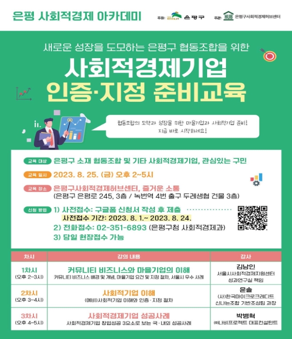 ÃÑ 3Â÷½Ã·Î ±¸¼ºµÇ¸ç Àü¹® °»çÁøÀÌ ¸¶À»±â¾÷ ¹× (¿¹ºñ)»çȸÀû±â¾÷ ÀÎÁõ‧ÁöÁ¤ ÀýÂ÷¿Í ±¹‧³»¿Ü »çȸÀû°æÁ¦±â¾÷ ¼º°ø»ç·Ê¿¡ ´ëÇØ ÀÚ¼¼ÇÏ°Ô ¾È³»ÇÒ ¿¹Á¤ÀÌ´Ù. ±³À° ½ÅûÀº ¿À´Â 24ÀϱîÁö È«º¸ À¥ÀÚº¸ÀÇ QRÄڵ带 ÅëÇØ ±¸±ÛÆû ½Åû¼¸¦ ÀÛ¼ºÇØ Á¦ÃâÇÏ¸é µÈ´Ù. ´çÀÏ ÇöÀå Á¢¼öµµ °¡´ÉÇÏ´Ù.