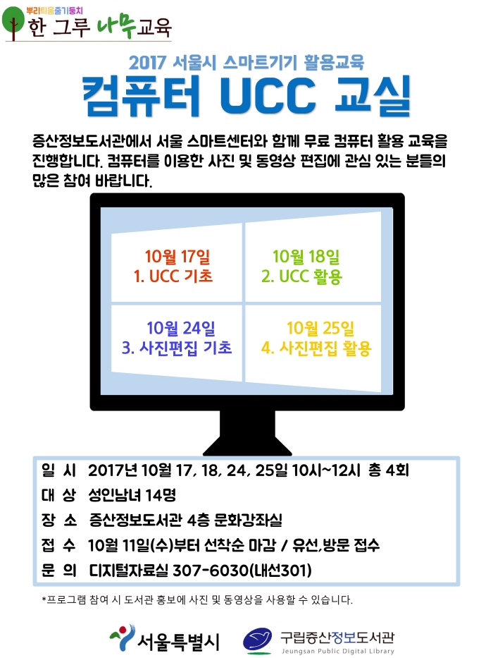 10¿ù 17, 18, 24, 25ÀÏ ÃÑ 4ȸ¿¡ °ÉÃÄ ÁøÇàµÇ´Â À̹ø ÇÁ·Î±×·¥¿¡¼´Â UCC¿Í »çÁøÆíÁý¿¡ ´ëÇÑ ÀÌÇØ¿Í Ȱ¿ëÀ» ´Ù·ç´Â °Àǰ¡ ÁغñµÇ¾î ÀÖÀ¸¸ç Âü¼®À» ¿øÇÏ´Â ¼ºÀγ²³à ´©±¸³ª ¼ö°ÀÌ °¡´ÉÇÏ´Ù.