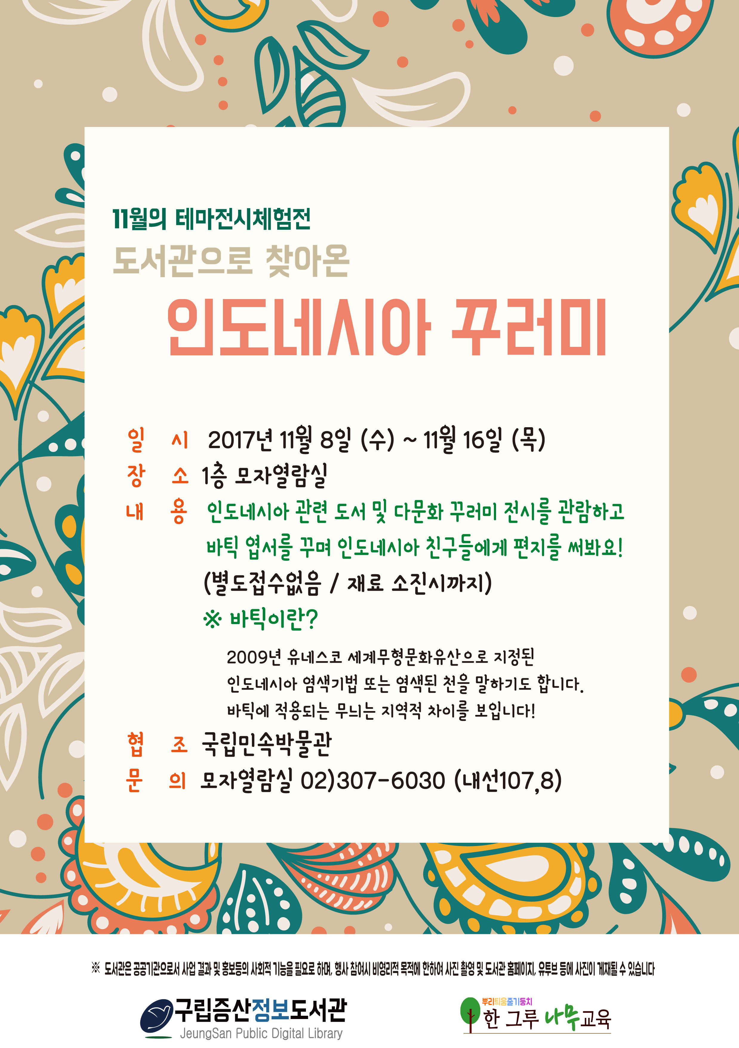 ±¸¸³Áõ»êÁ¤º¸µµ¼°ü(°üÀå ±è¼÷°æ)Àº ±¹¸³¹Î¼Ó¹Ú¹°°üÀÇ ÇùÁ¶·Î Àεµ³×½Ã¾Æ ´Ù¹®È²Ù·¯¹Ì, µµ¼ Àü½Ã ¹× üÇè ÇÁ·Î±×·¥ <µµ¼°üÀ¸·Î ã¾Æ¿Â Àεµ³×½Ã¾Æ ²Ù·¯¹Ì>¸¦ ½Ç½ÃÇÑ´Ù. Àεµ³×½Ã¾Æ »ýȰ¿ëǰ, ¿Ê, ¾Ç±â µîÀ¸·Î ±¸¼ºµÈ Àεµ³×½Ã¾Æ ´Ù¹®È ²Ù·¯¹Ì¸¦ °ü¶÷Çϰí À¯³×½ºÄÚ ¹«ÇüÀ¯»êÀ¸·Î ÁöÁ¤µÈ ¹Ùƽ ¹®¾ç ¿±¼¸¦ ²Ù¹Ì´Â Ȱµ¿À» ÅëÇØ ´Ù¾çÇÑ ¹®È¿¡ ´ëÇÑ °ü½É°ú ¹®È ´Ù¾ç¼ºÀ» ÀÌÇØÇÒ ¼ö ÀÖ´Â ±âȸ¸¦ ¸¶·ÃÇϰíÀÚ ÇÑ´Ù.