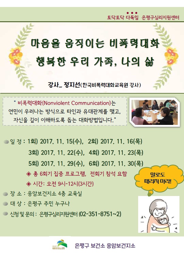 ÀºÆò±¸º¸°Ç¼Ò ÀÀ¾Ïº¸°ÇÁö¼Ò´Â 11¿ù 15ÀϺÎÅÍ 30ÀϱîÁö ÀÀ¾Ïº¸°ÇÁö¼Ò 4Ãþ ±³À°½Ç¿¡¼ ÀºÆò±¸ ÁÖ¹ÎÀ» ´ë»óÀ¸·Î ºñÆø·Â´ëÈ ÇÁ·Î±×·¥ ¡¸ÇູÇÑ ¿ì¸® °¡Á·, ³ªÀÇ »î¡¹À» ½Ç½ÃÇÑ´Ù.